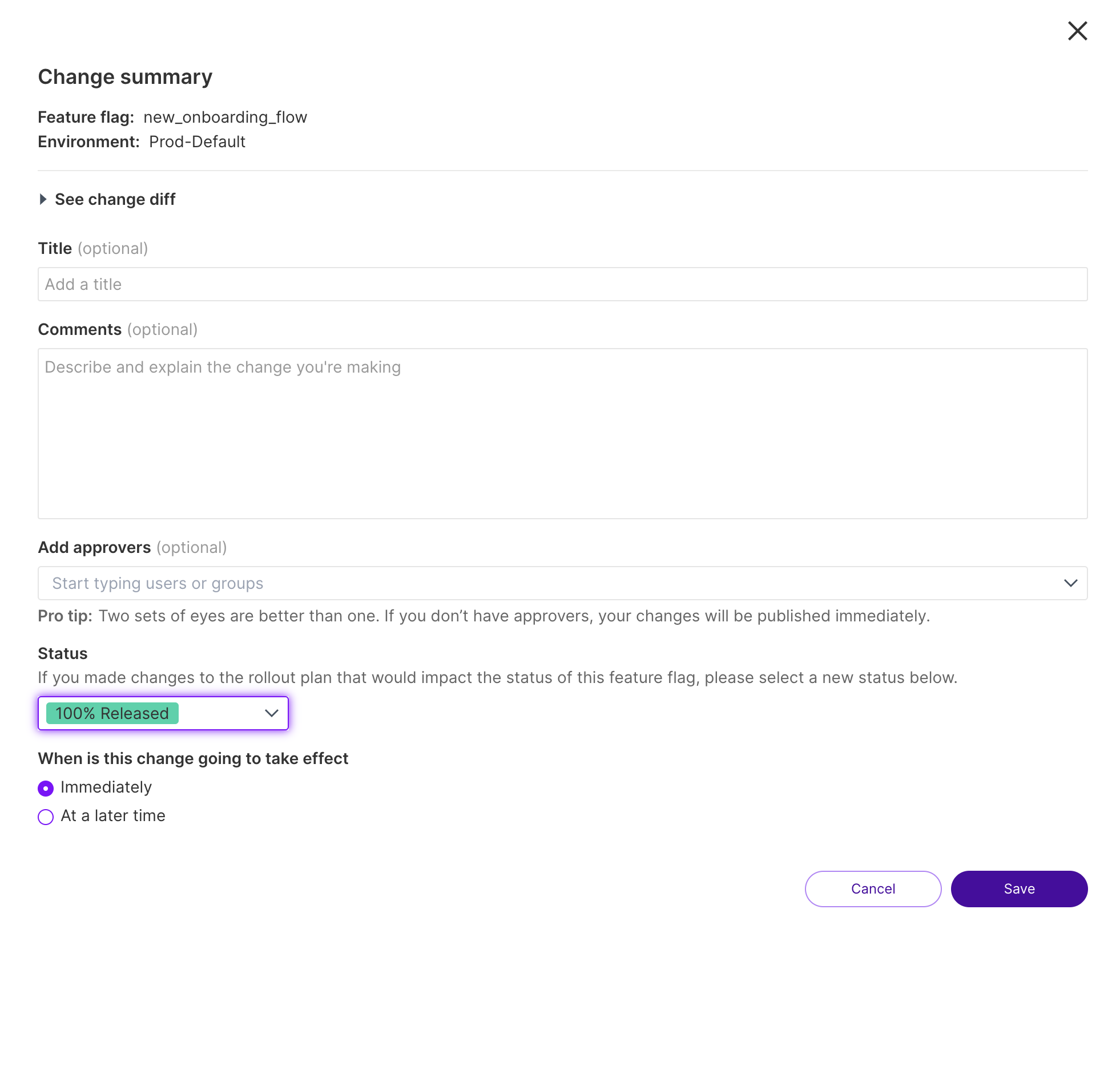 - At a later time: The change takes effect on a specified date and time