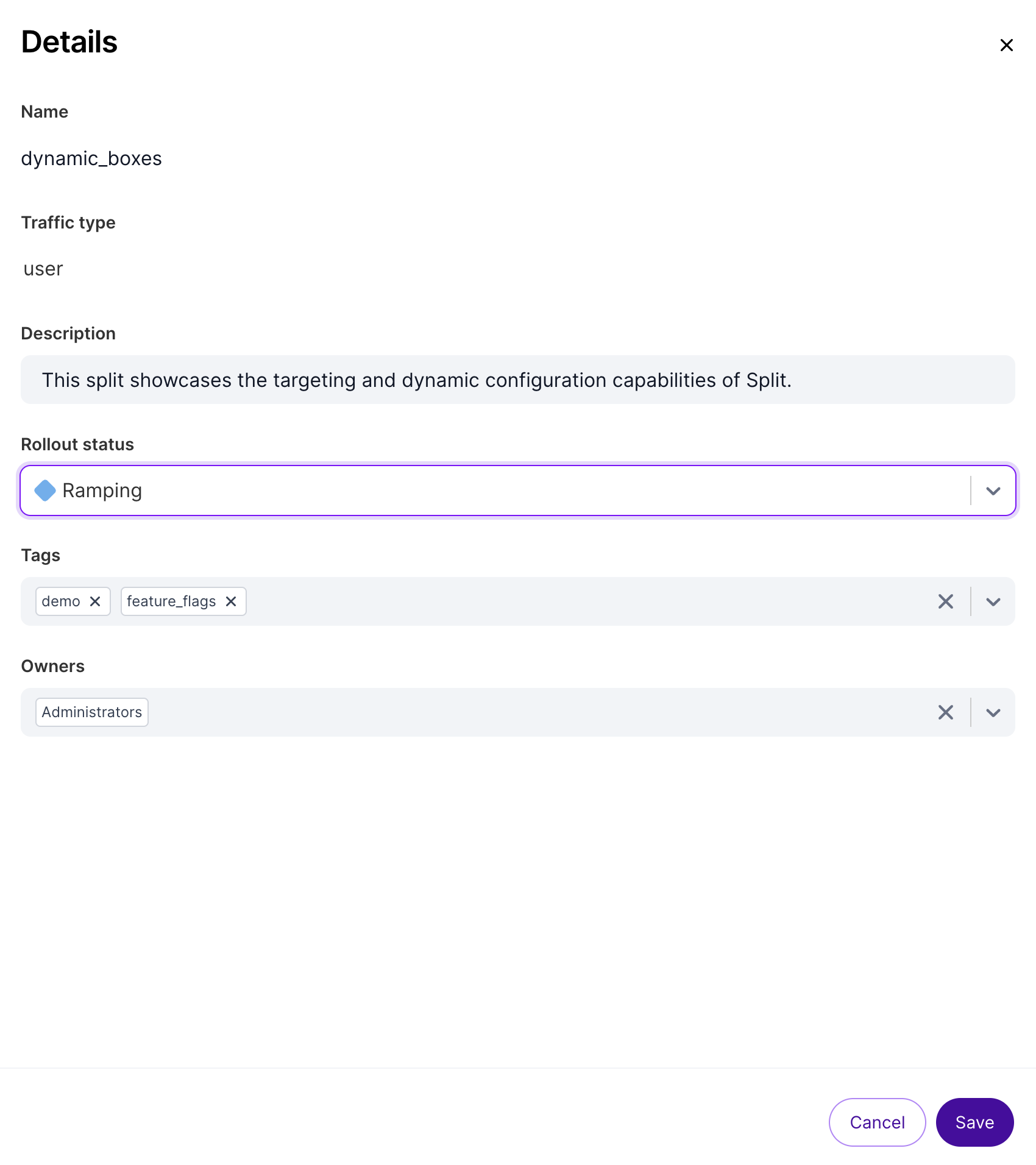 Ramping (blue): Indicates feature flags that are turned on for a small percentage of users to make sure no performance issues or larger issues come up.