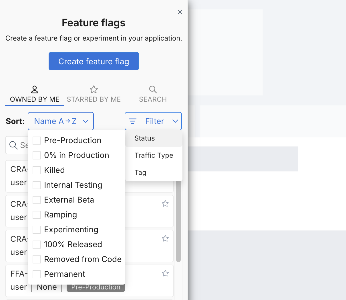 From the feature flag list view, select Filter and then Status. The list of filters displays.