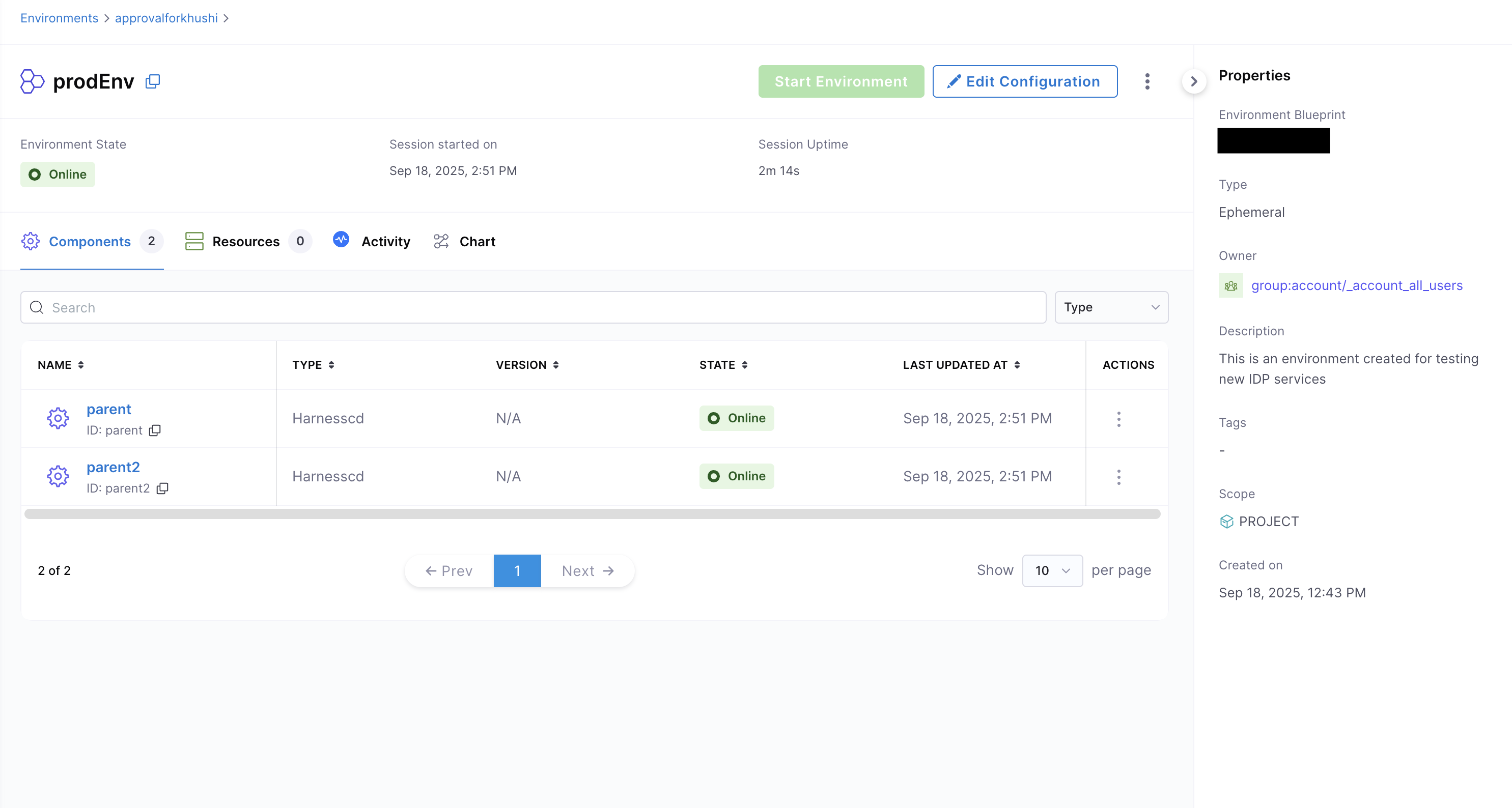 Environment management in Harness IDP enables integration with Harness Pipeline Approvals. This feature allows you to add approvers in the CD service pipeline and control the environment creation process through pipeline approvals and rejections.