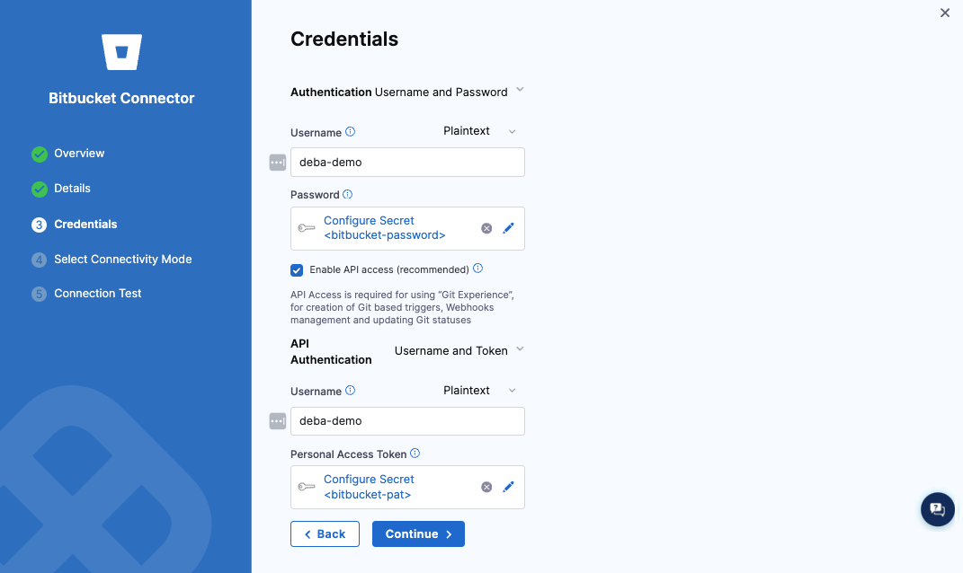 - From the dropdown under Select Bitbucket Connector and either select an already present connector or create +New Connector.