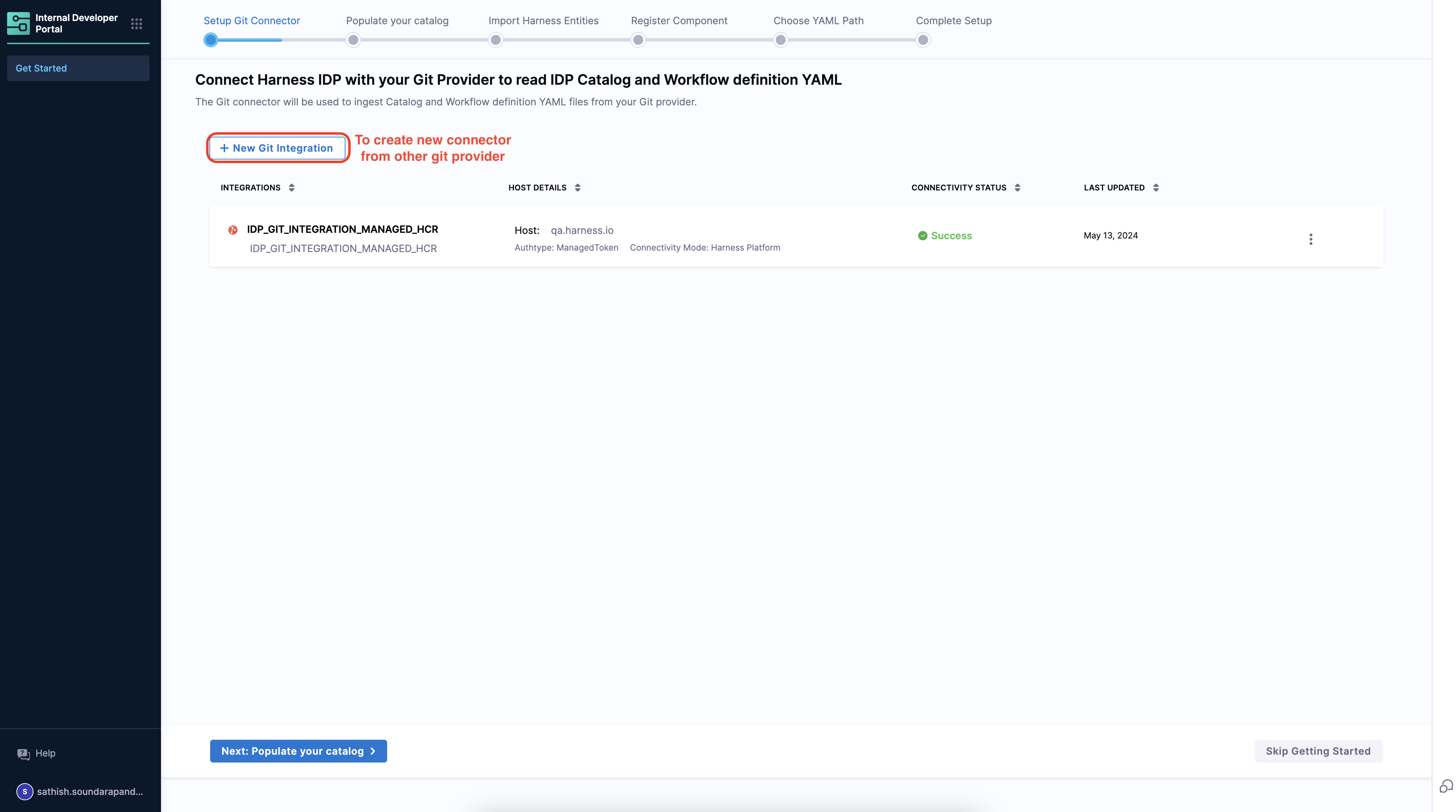 - You can as well create a new connector for other git-providers under the +New Integration.  If you already have a connector available which you want to use in IDP to save your catalog-info.yaml, then select the connector under Select Git Connector, use a URL to validate and save the connector. If you don't have your connector configured already follow the steps mentioned below.