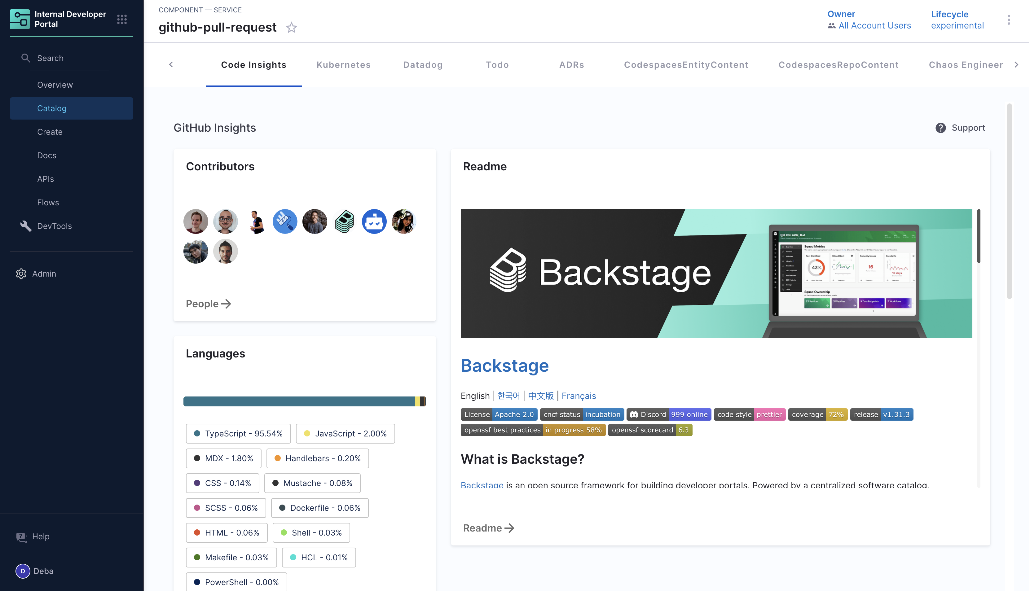 This plugin exports a UI tab that you can use as a new tab for a service or for any other layout page. It also exports several cards that can be added to the Overview section of a catalog layout. Go to Admin > Layout, select Service in the dropdown menu, and then add the following YAML code in a new section:
