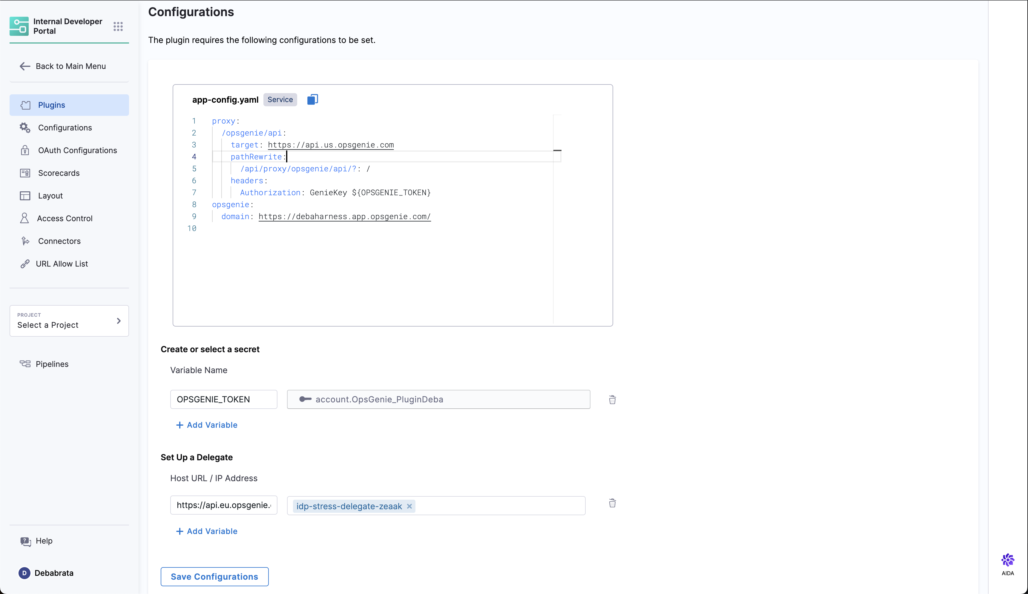 - Under the Plugins tab in Admin, go to app-config.yamland Edit YAML to configure your Opsgenie instance in the target field and add your domain in the format as shown below.