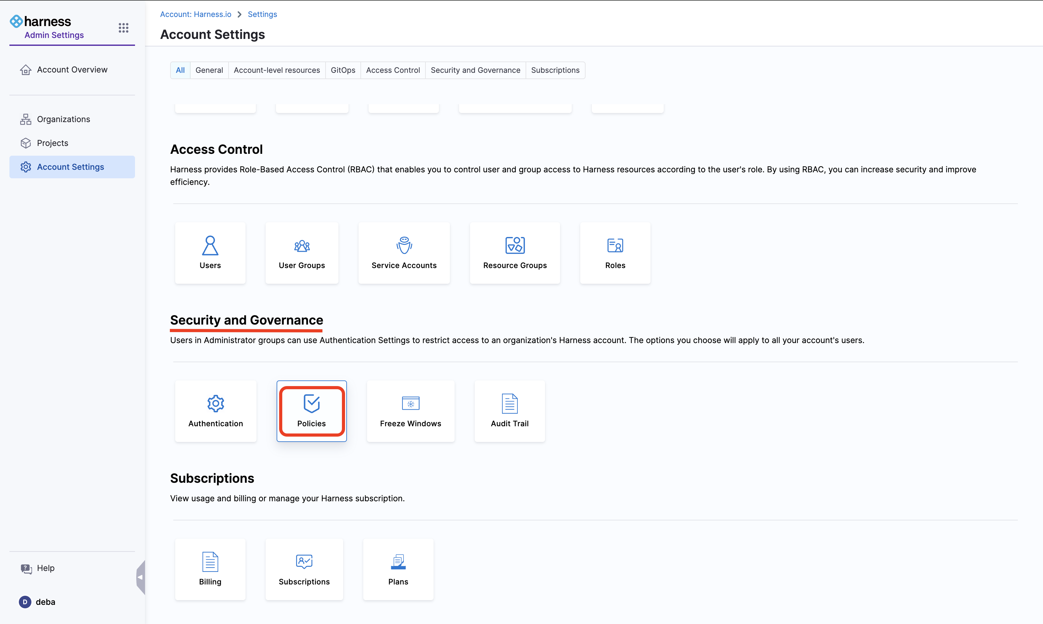 Harness provides governance using Open Policy Agent (OPA), Policy Management, and Rego policies.