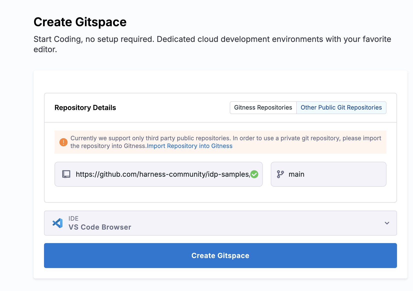 Now Create Gitspace, by selecting the default branch as mainand IDE.