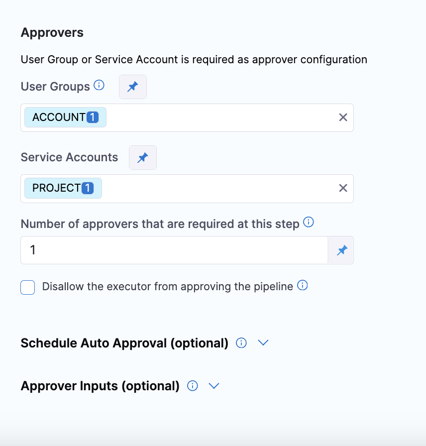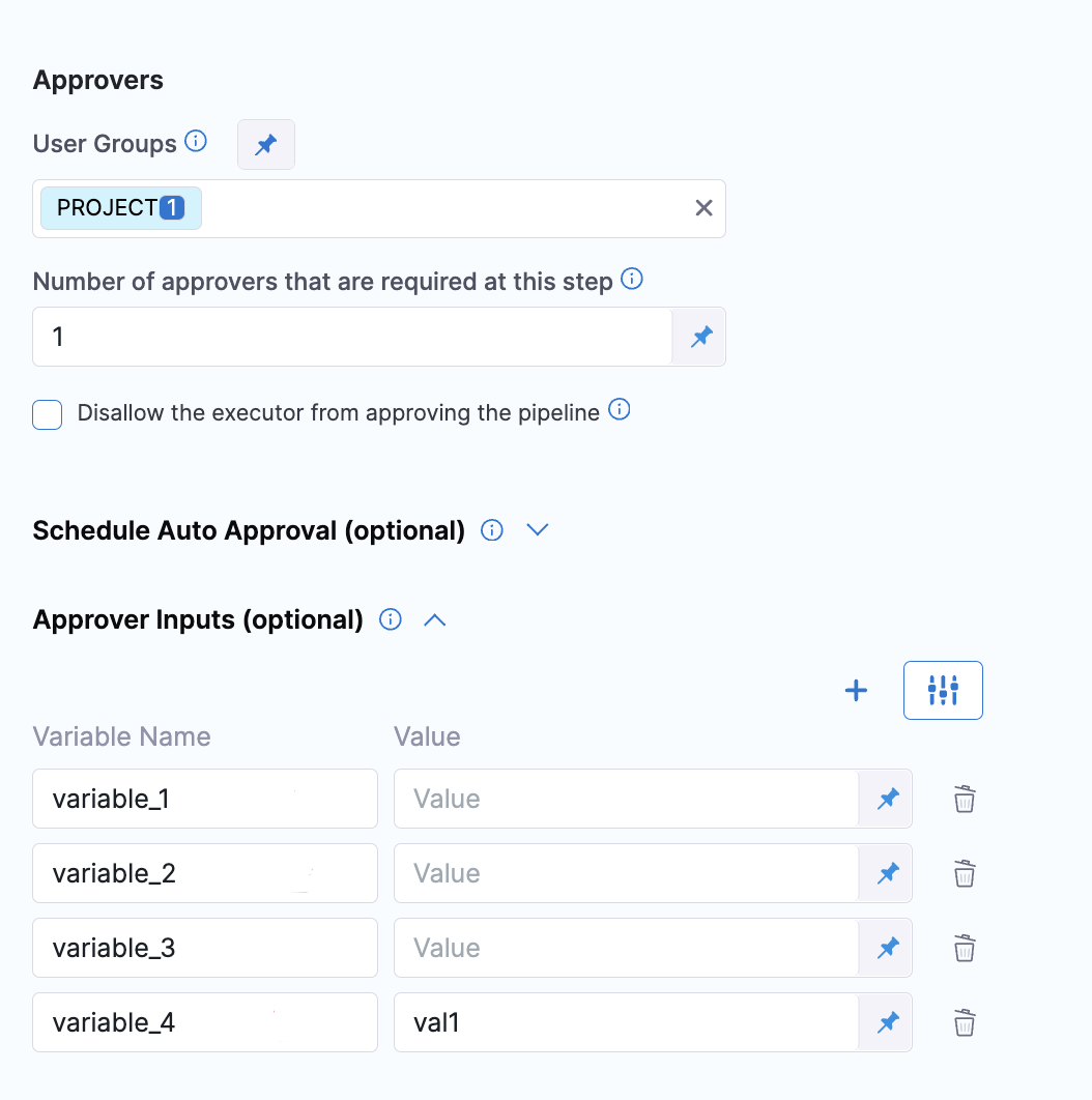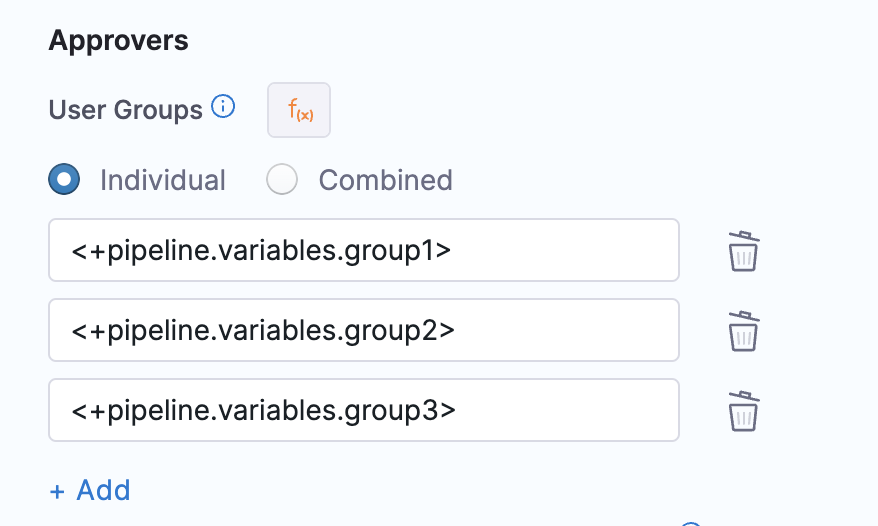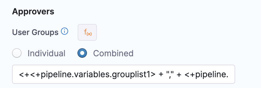 Combined: Specify a combined expression for all user groups that need to be configured as Approvers. This expression must resolve to a list of strings. Following example shows a combined expression: <+ <+pipeline.variables.grouplist1> + "," + <+pipeline.variables.grouplist2> >.split(",")The expression <+pipeline.variables.grouplist1>resolves to_project_all_users,testUserGroupand the expression<+pipeline.variables.grouplist2>resolves toorg._organization_all_users,account._account_all_users. The above two expressions resolve to a string of comma-separated user groups. The combined expression resolves to a list of the following user groups:- _project_all_users