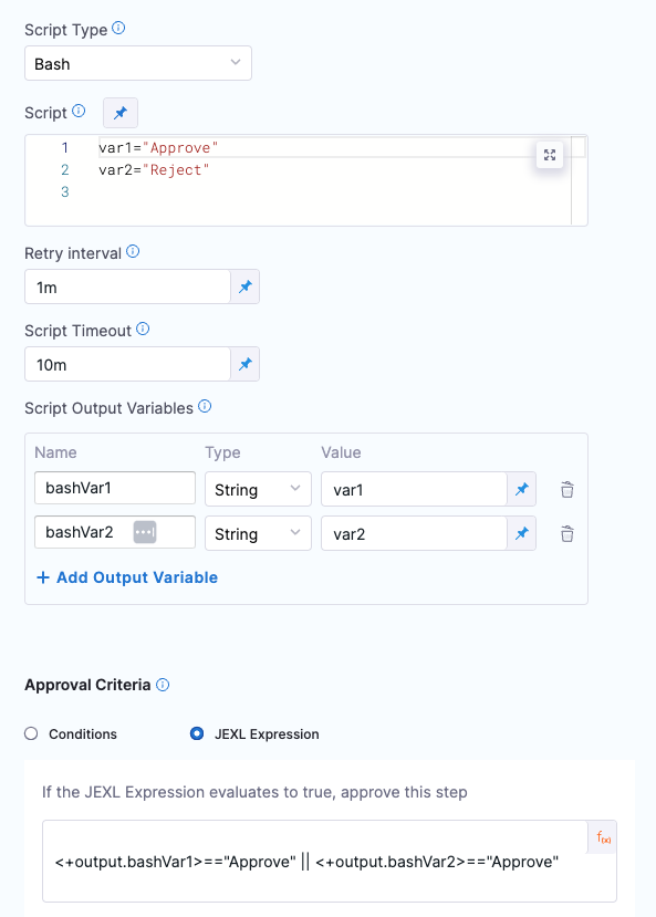 - For example, you could evaluate the output from a previous Shell Script step named test by referencing its output in a JEXL expression and comparing it to the value Approved:<+execution.steps.test.output.outputVariables.status>=="Approved".