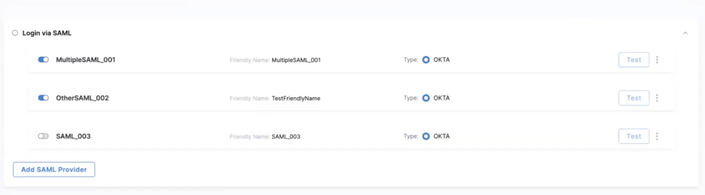 Select Submit. The SAML provider is now listed in Login via SAML.  Configure more SAML providers by repeating the steps.