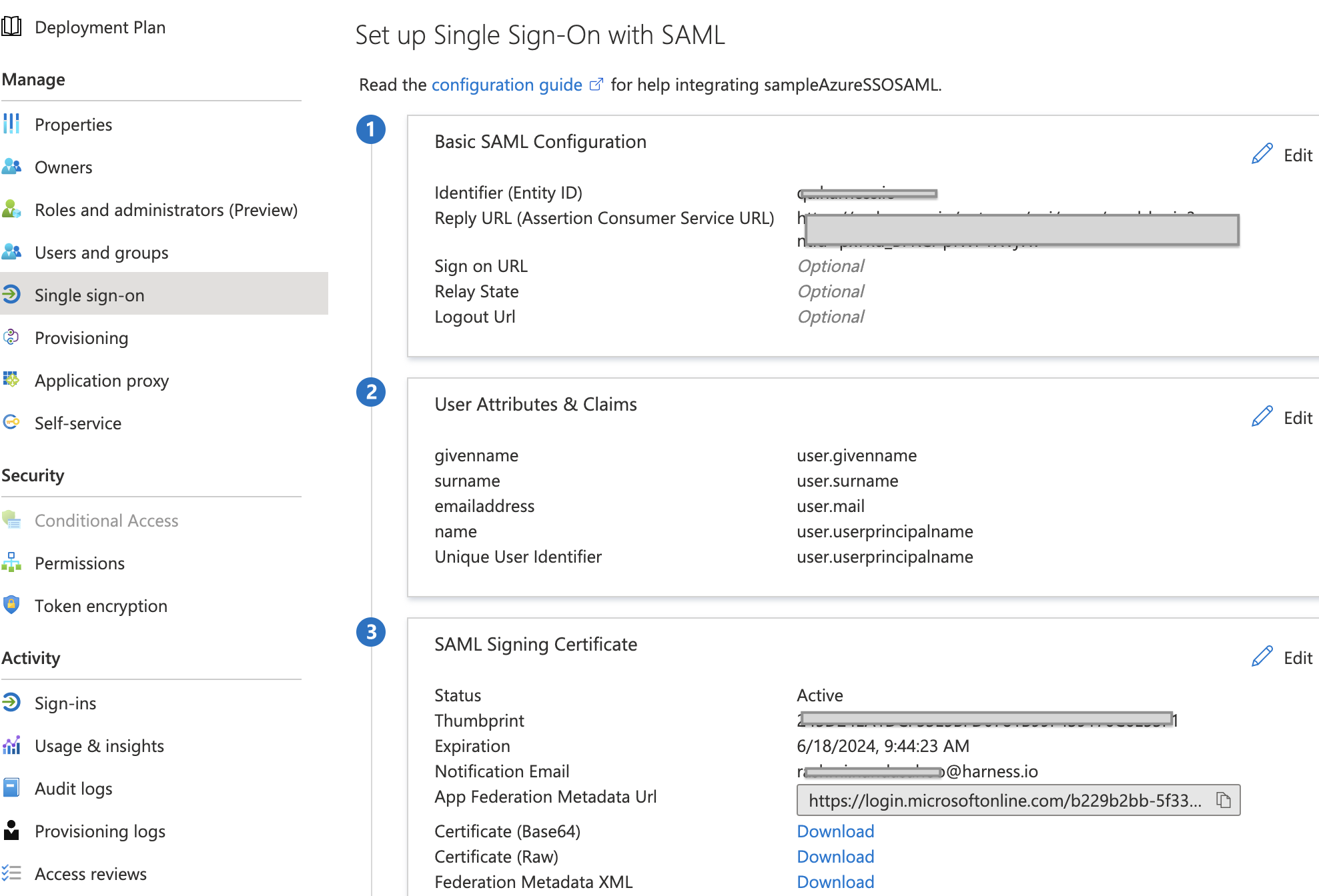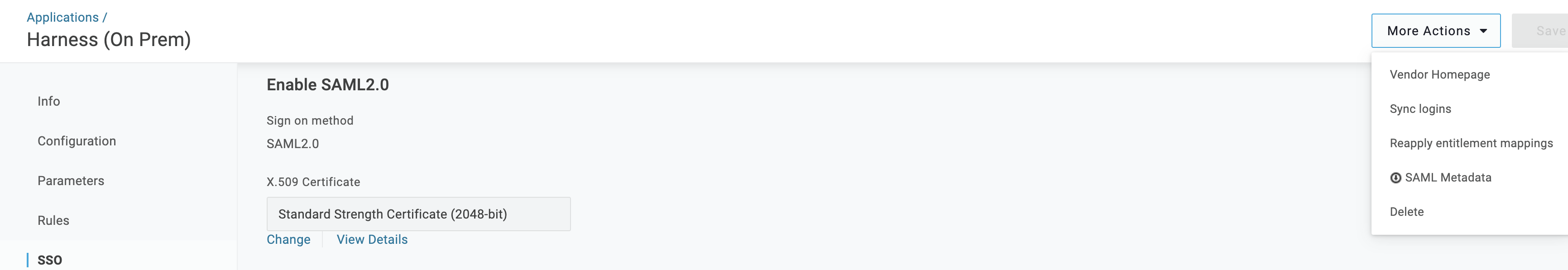 - SAML metadata file: This file is provided by your SAML provider app. You upload this file into the Harness Single Sign-On (SSO) Provider dialog to integrate the app with Harness.