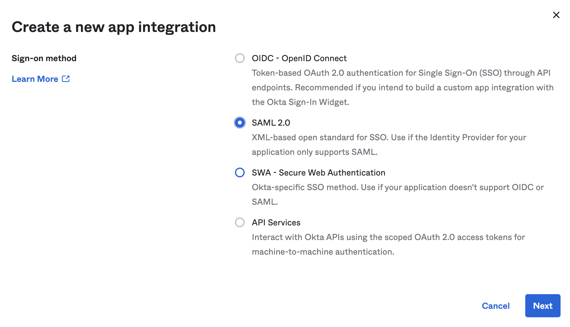 Select Create App Integration.  The Create a new app integration dialogue opens.