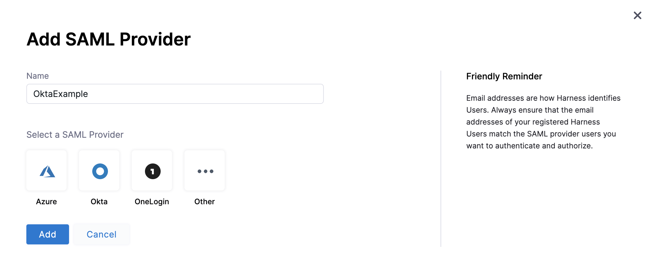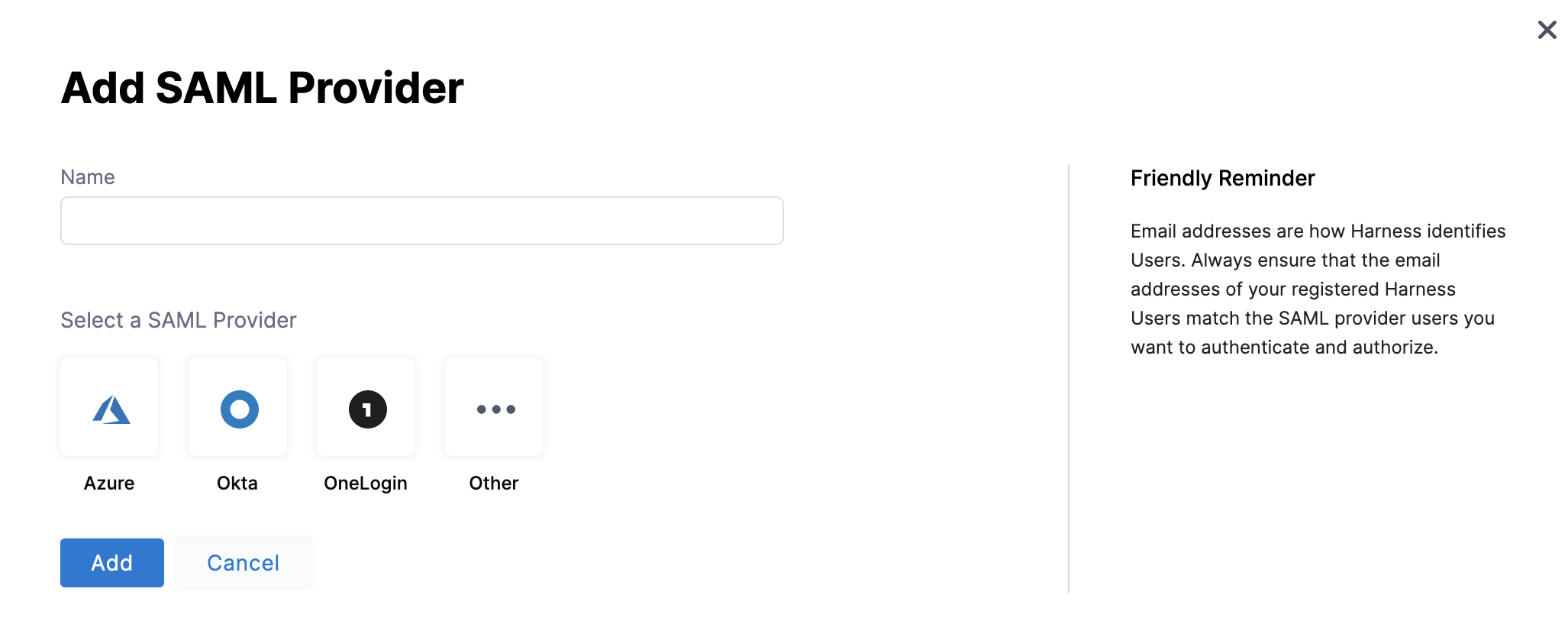 - SAML provider user email addresses: To use the SAML provider to verify Harness Users, the email addresses used in the SAML provider must match the email addresses for the registered Harness Users you want to verify.