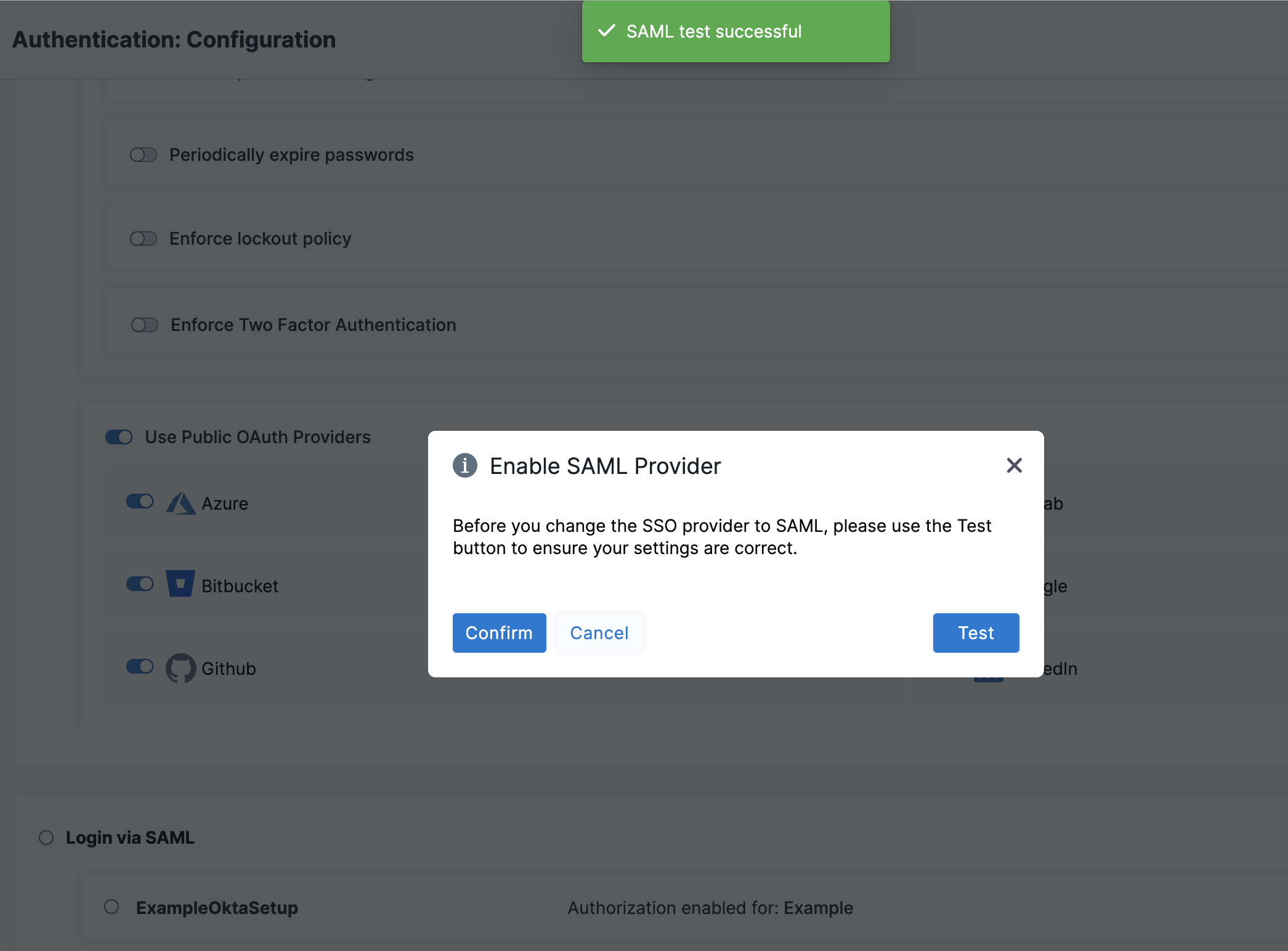 Once the test is successful, click Confirm to finish setting up OneLogin authentication.
