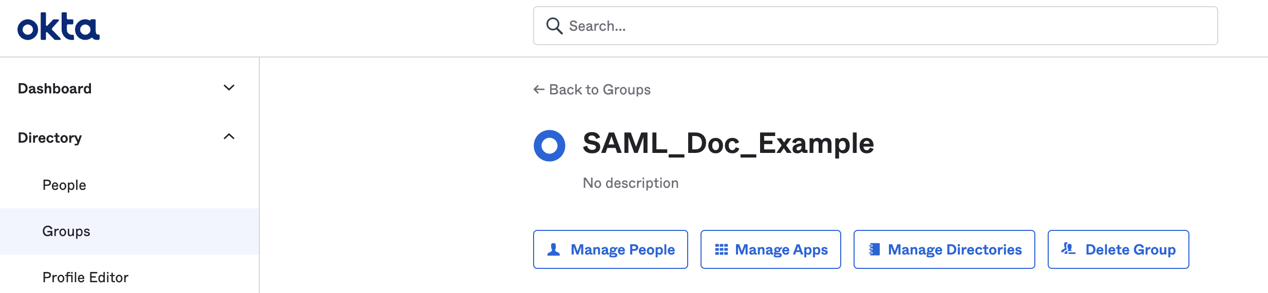 In Okta, create a user group and add users to the group, if you don't already have such a group. -