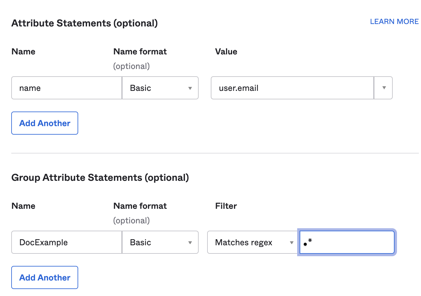 In Group Attribute Statements (optional), enter a name in the Name field, select Name format (optional) as Basic, select an appropriate Filter and enter its value. If your Okta org uses groups to categorize users, you can add group attribute statements to the SAML assertion shared with your app. For more information, go to the Okta documentation on Defining Group Attribute Statements.