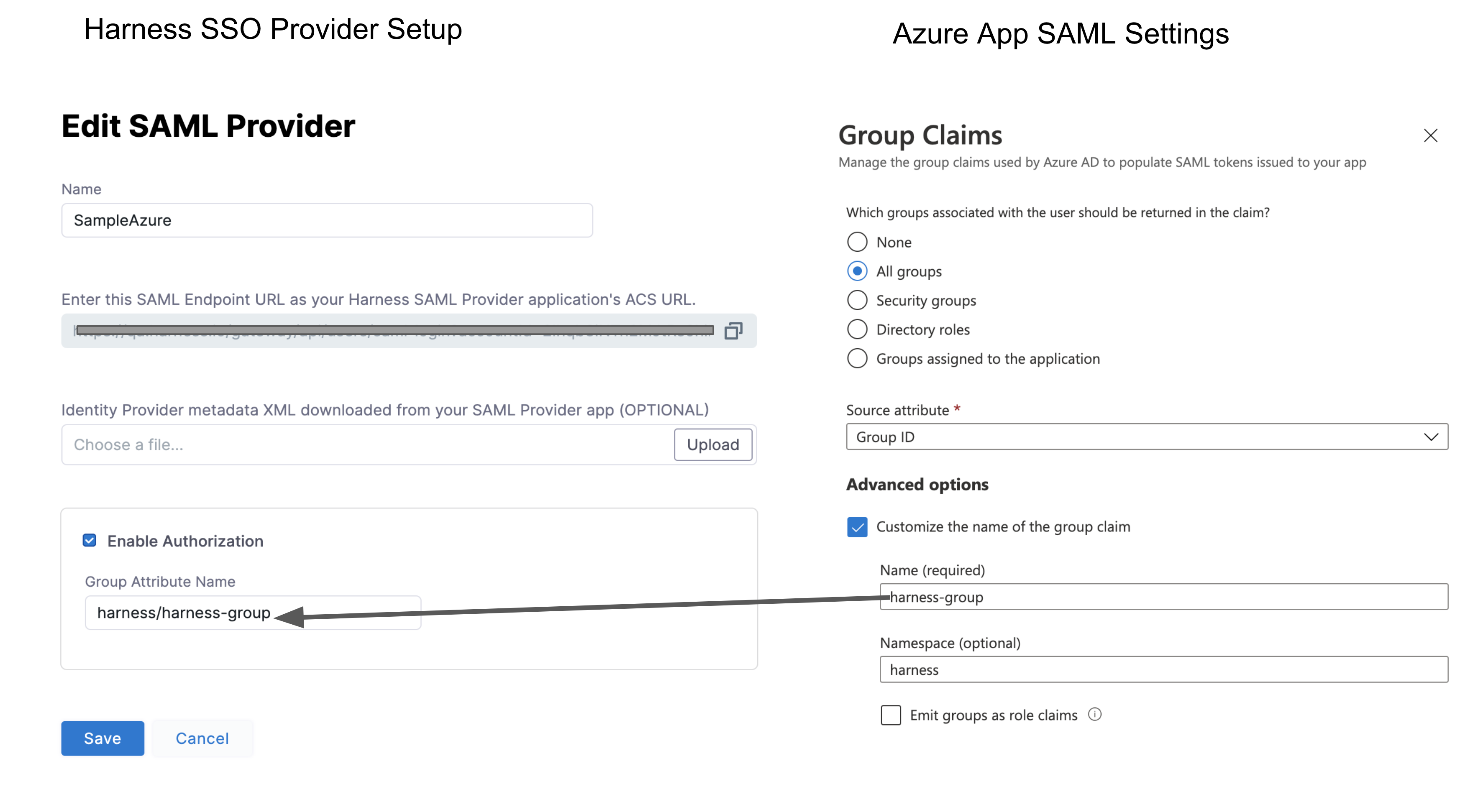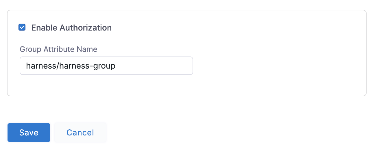 Set up SAML SSO in Harness as described in SAML SSO with Okta. Enabling SAML authorization will authorize the same Harness users that are authenticated using your SAML provider. noteHarness uses email addresses to match Harness user accounts with Okta user accounts. Make sure the email addresses of your registered Harness users match the Okta users you want to authenticate and authorize.