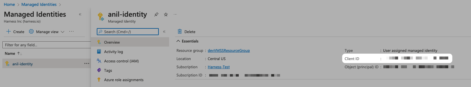 In Microsoft Azure, go to the App registration Overview or Managed Identity page and make note of the Application (client) ID and Directory (tenant) ID. The Application (client) ID is the application Id for the app registration you want to use the Harness connector. To access resources in your Azure subscription, you must assign the Azure App registration using this Application Id to a role in that subscription. For more information, go to the following Microsoft documentation: - Quickstart: Register an application with the Microsoft identity platform