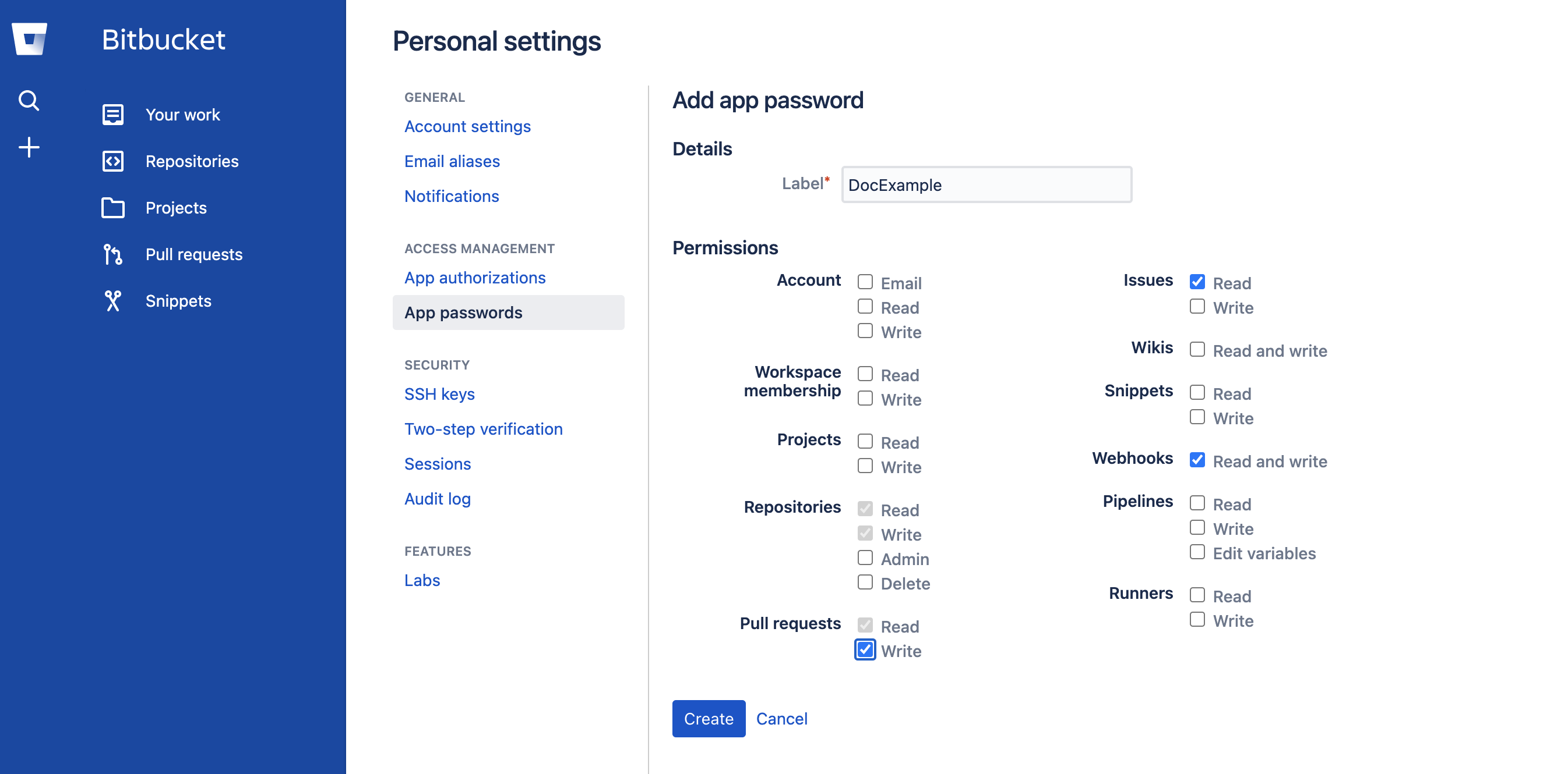 - Username and Password. This is the Bitbucket username and App password in your Bitbucket account settings.