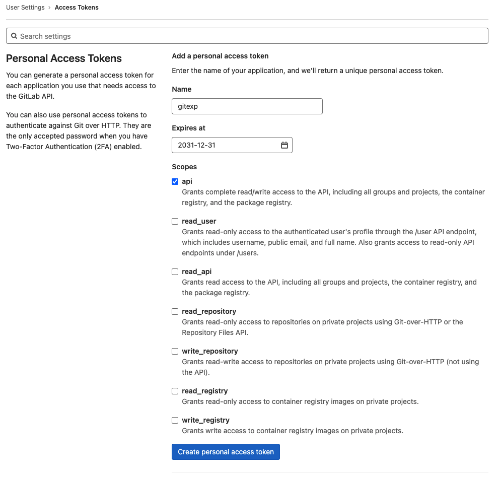 - Scopes: for Personal Access Tokens, Code: Full.