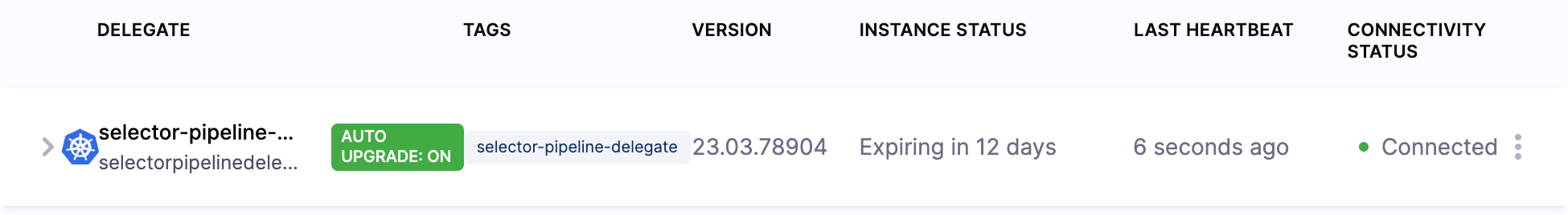 You can confirm the successful deployment and registration of the delegate in Harness Manager. Check the delegate information to ensure that auto-upgrade is not enabled.