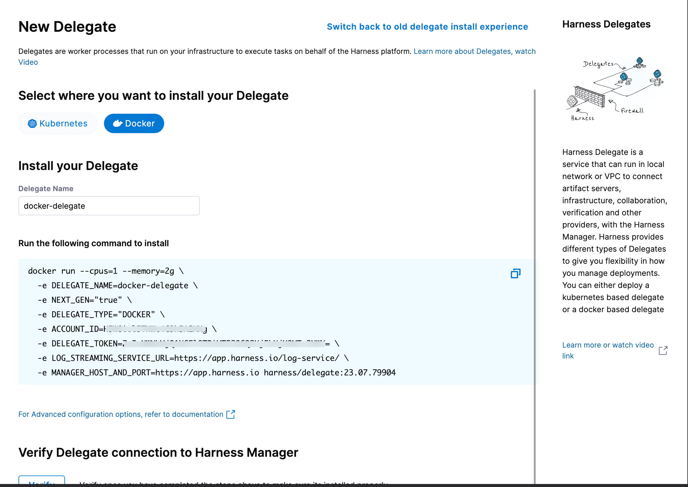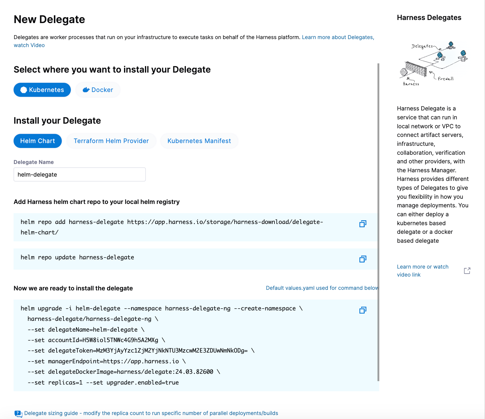 Expand the section below for instructions on installing the default delegate for your Harness account. It can be either a Kubernetes delegate installed using a Helm chart, Terraform Helm Provider, or Kubernetes manifest or a Docker delegate using the docker run command. For more information, go to Install Harness Delegate on Kubernetes or Docker.