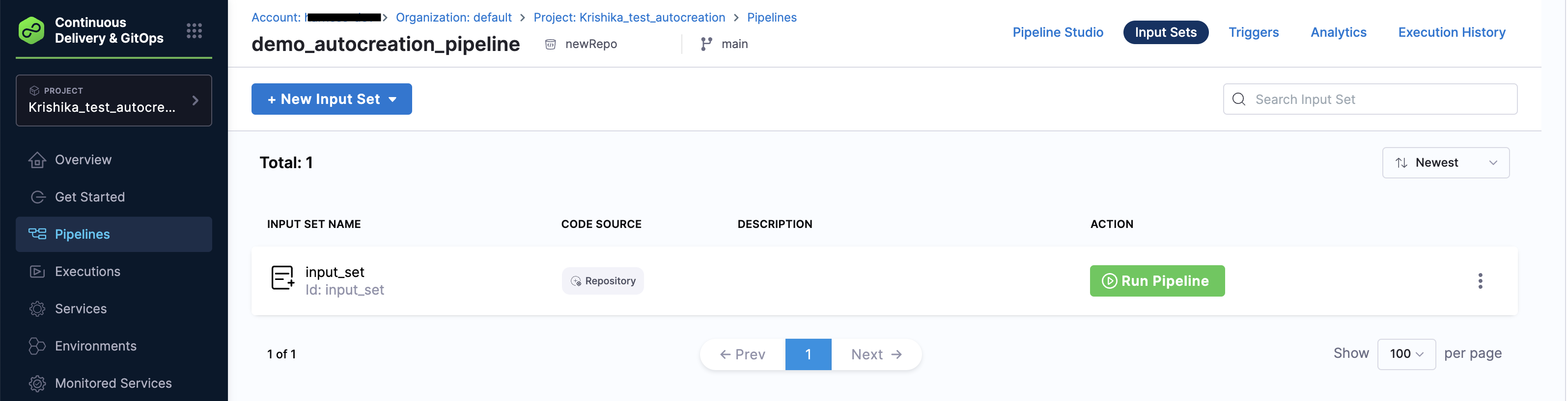 After pushing the changes, we will see that Input set named as input_set is created for the pipeline demo_autocreation_pipeline.