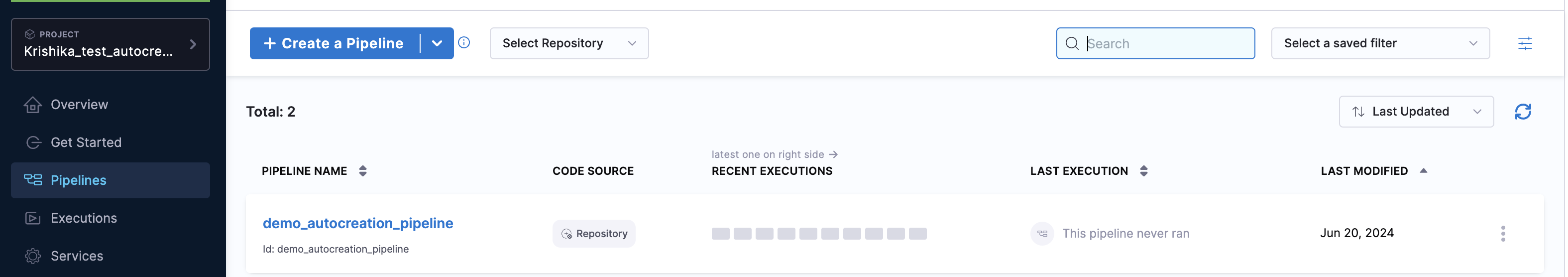 After pushing the changes, pipeline named as demo_autocreation_pipeline is created in Organization default under the Project Krishika_test_autocreation .