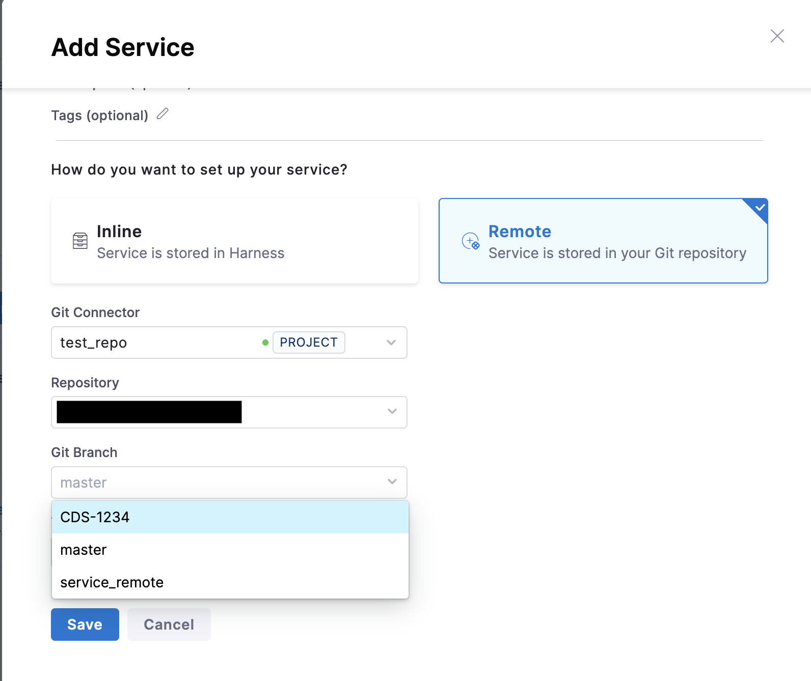 In Git Branch, select a branch. If your branch isn't listed, enter its name. Create the branch in your repository before entering it in Git Branch. Harness does not create the branch for you. Save the service to the default branch on the first save. You can then create different branches in the Harness repo if you want to create different versions of your service.  Harness Git Experience auto-populates the YAML Path. You can change this path and the file name.