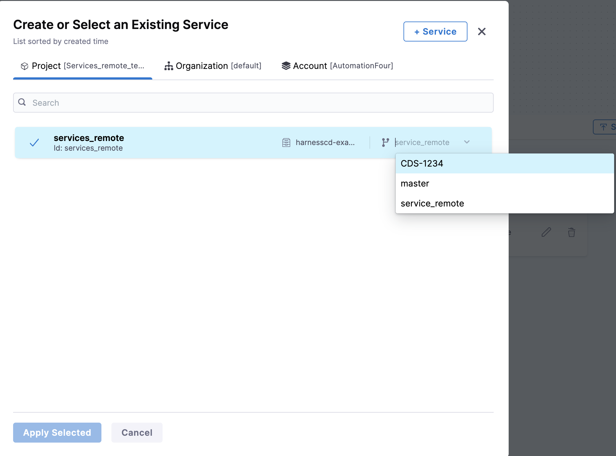 - When the remote service is linked to the pipeline, the branch of the service is displayed as __DEFAULT__.__DEFAULT__resolves to the same branch as the pipeline when both the service linked to the pipeline are in the same repository. If the pipeline resides in a different repository, then DEFAULT resolved to the main branch of the repository where the linked service resides.