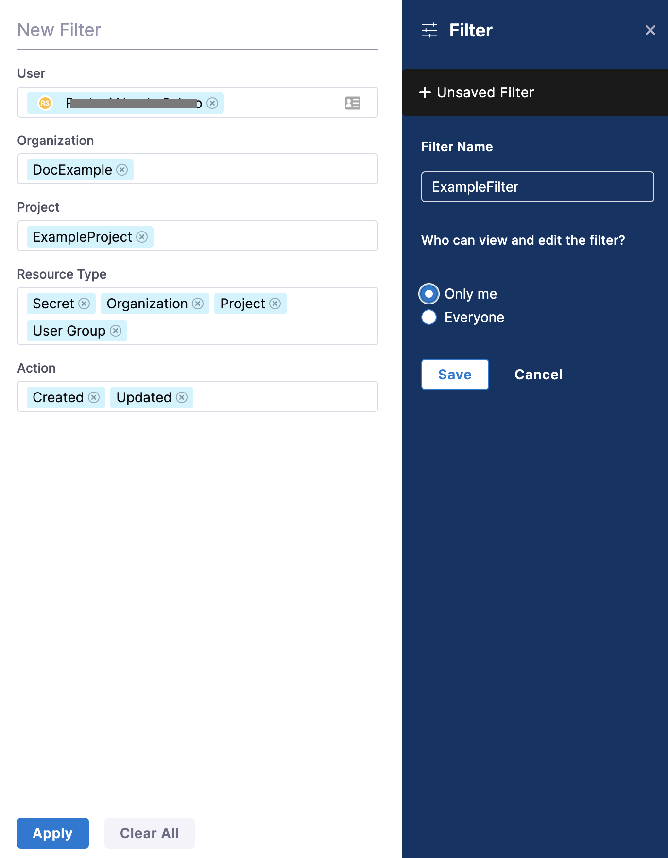 In the New Filter settings, select the filters to scope down the viewable audit events. You can scope down the viewable audit events by adding filters and selecting: - User