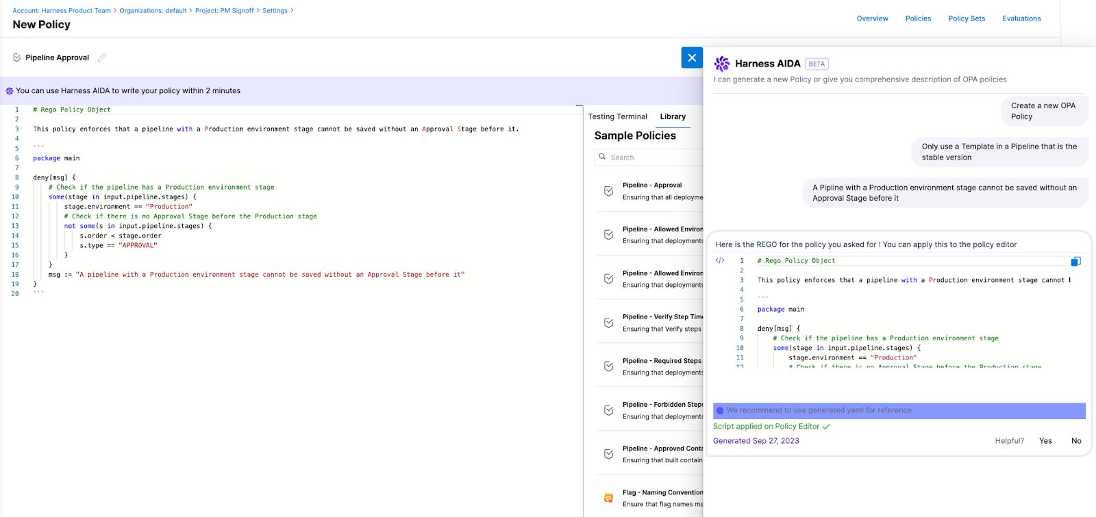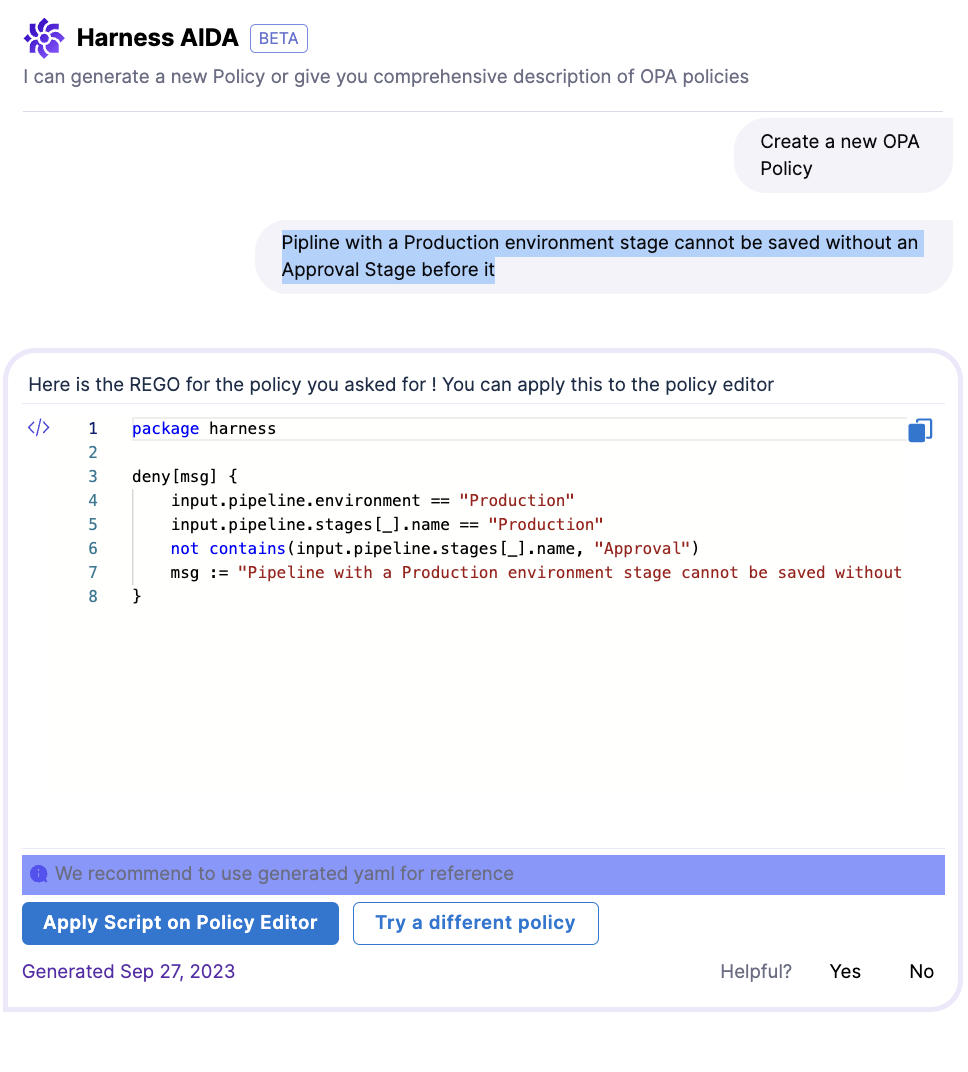 Create OPA Policies: Harness AIDA helps you get started and write OPA Policies based on pipelines, connectors, and templates, and other Harness objects with no need to understand the nuances of REGO (Open Policy Agent language).