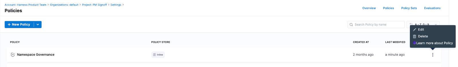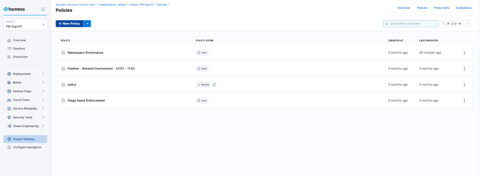 - In the Harness application, go to Policies.