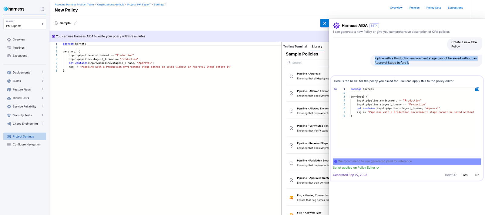 Create a Policy by using Harness AIDA