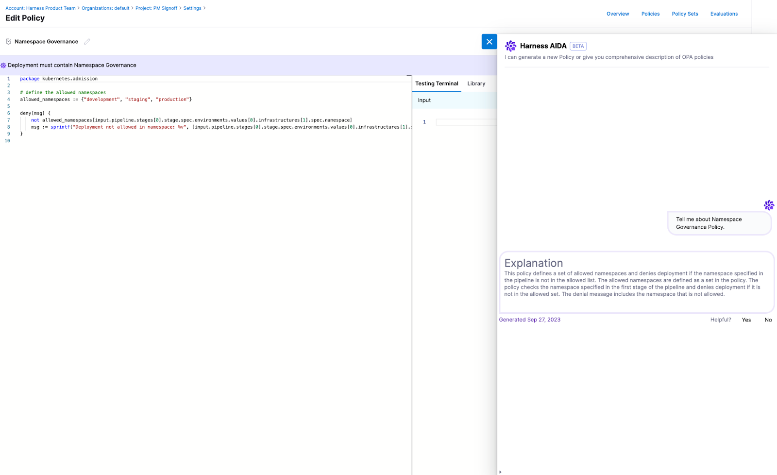 Describe existing OPA Policies: Harness AIDA offers detailed descriptions of policies. This helps users understand what a policy does without having to fully understand REGO syntax and reading and tracing comments in the policy.