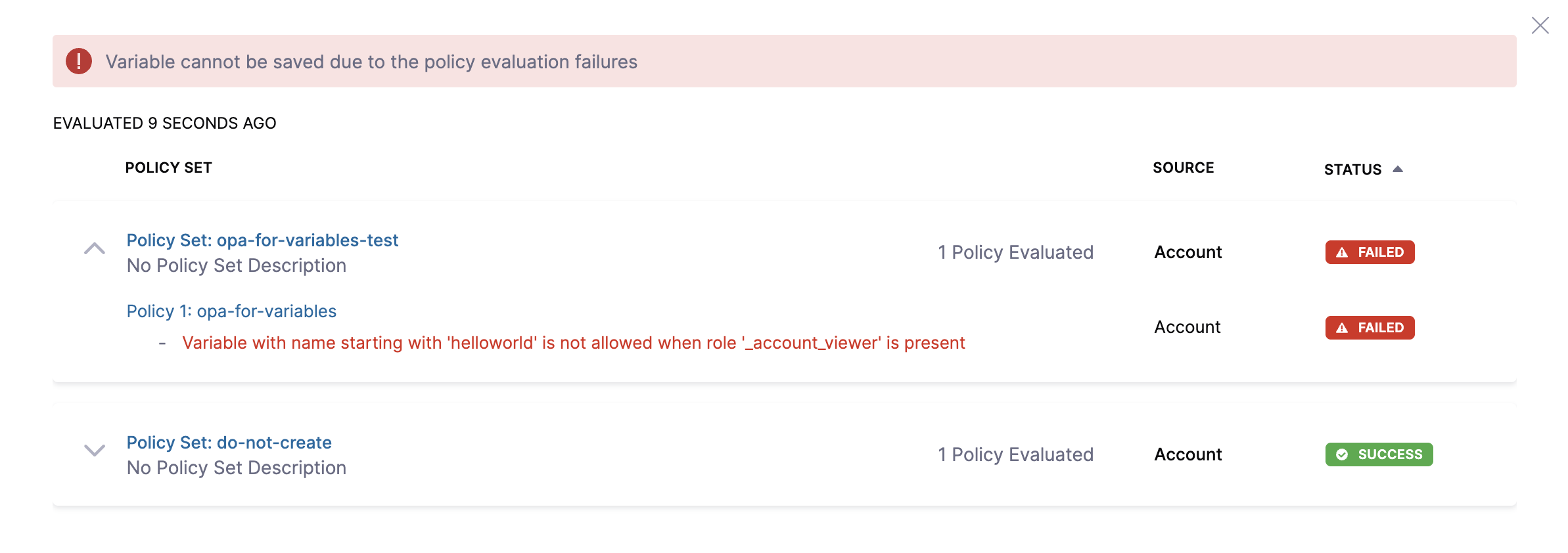 This feature is currently behind the feature flag PL_ENABLE_OPA_FOR_VARIABLES. Contact Harness Support to enable the feature.