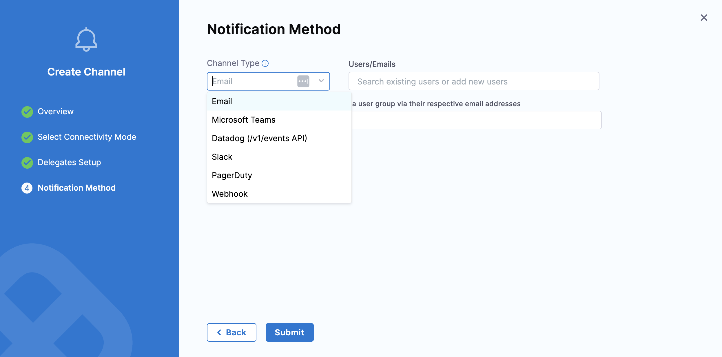 Notification Method: Once the connectivity mode is configured, select the Channel Type and add details related to the channel type to proceed. noteIf you select the Connectivity Mode as "Connect through a Harness Delegate" and Channel Type as "Email", ensure to add an SMTP configuration to which the Harness delegate has access. If this is not done, then the Email notifications will fail.