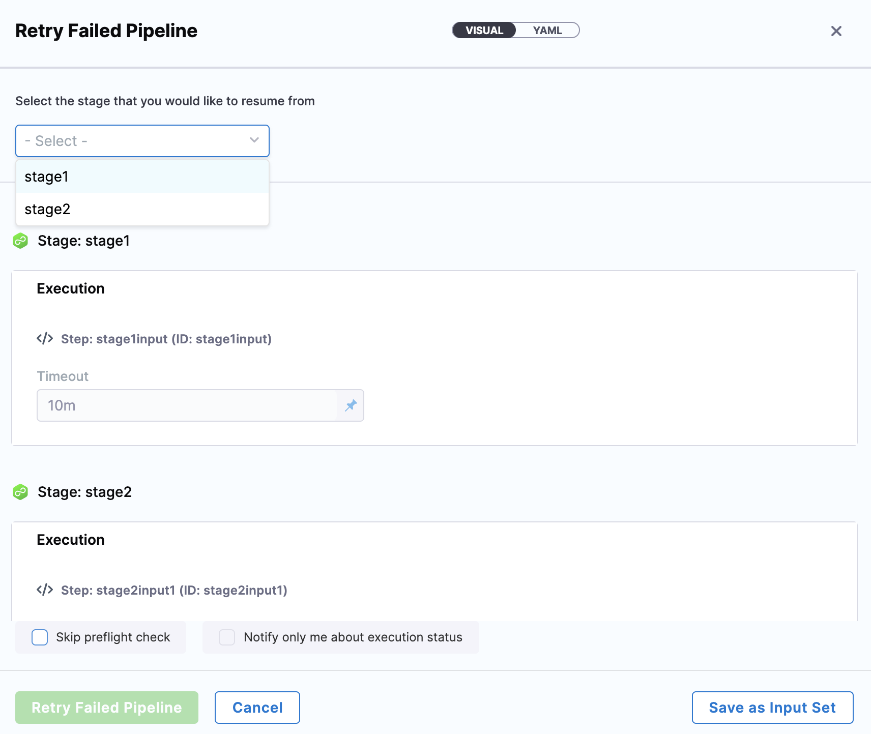 In the Retry Pipeline settings, select the stage from which you want to retry the Pipeline. If your pipeline uses runtime inputs, these are automatically populated from the previous execution.