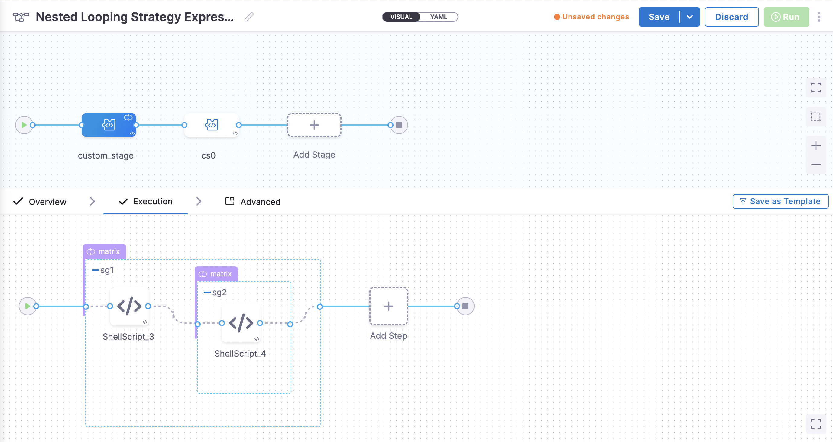 Because stages and steps can't have the same identifier, the index value of the iteration count is appended to the base stage/step identifier to create unique identifiers for each stage/step instance created by the looping strategy. If you need to use an expression that references the identifier of a stage/step instance in a looping strategy, you must use the identifier with the appended index value.