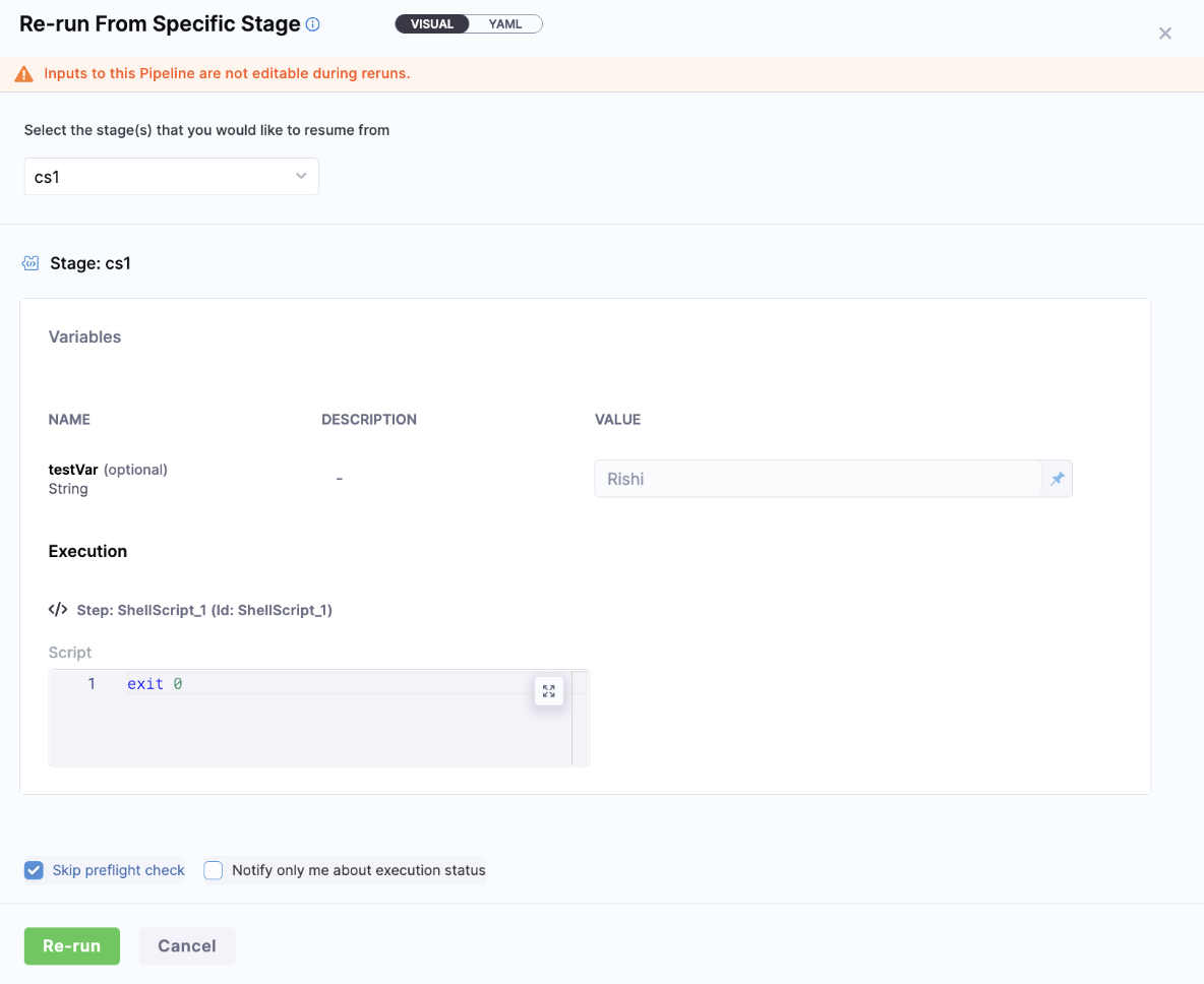 You can configure your pipelines to have no Input change during re-run. This allows you to have consistency in re-run behavior, especially in pipelines where input changes should be restricted after the initial execution.