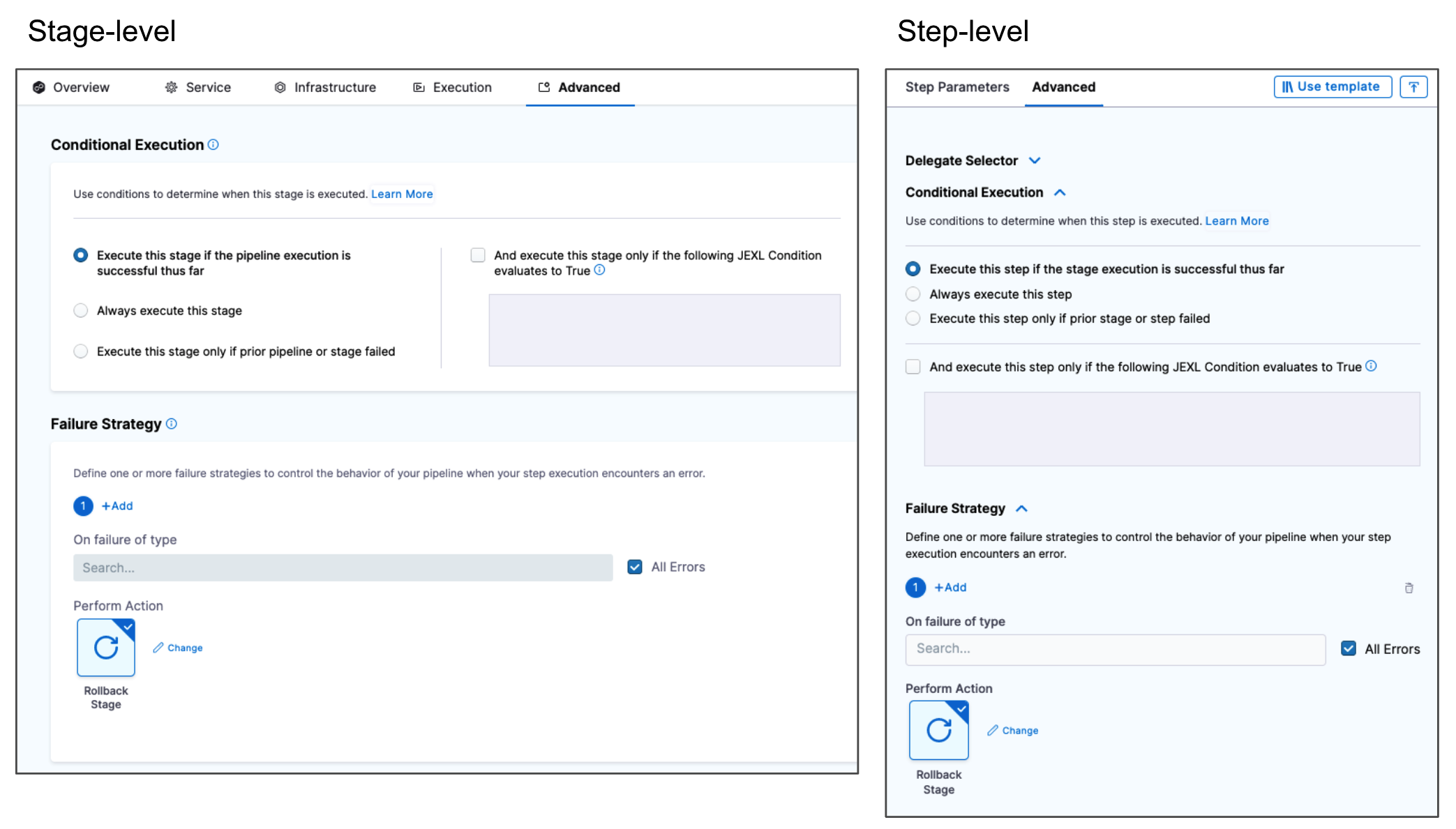 • Stages: A stage's conditional execution settings apply to all steps in that stage that don't have their own step-level conditional execution settings.