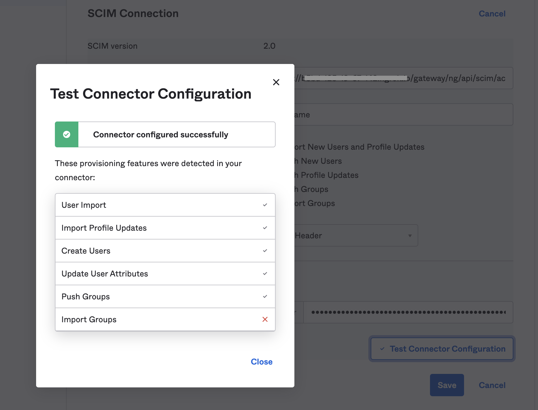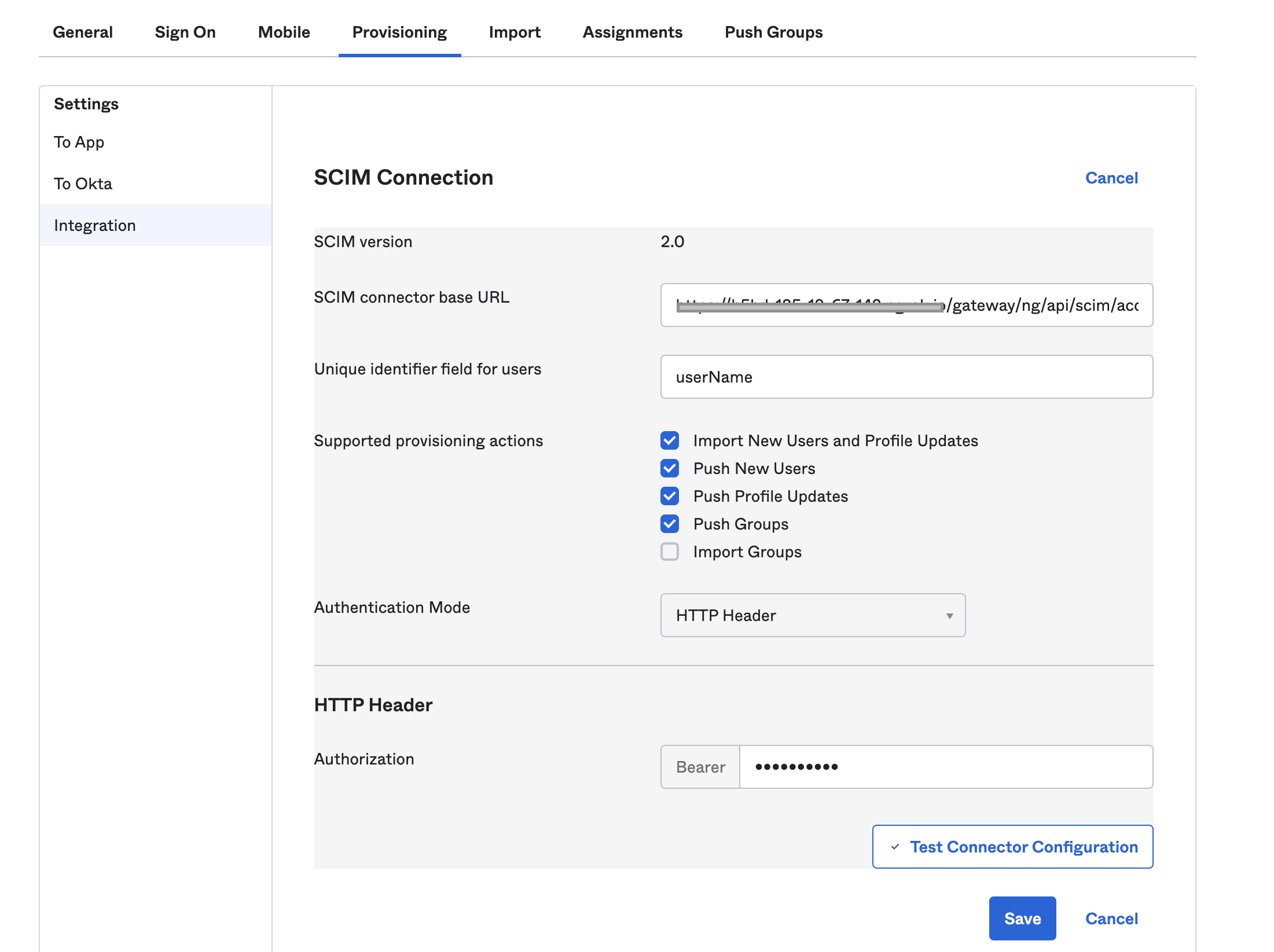 For SCIM connector base URL, enter the base URL for your API endpoint. The base URL format is: https://app.harness.io/gateway/ng/api/scim/account/YOUR_ACCOUNT_IDReplace YOUR_ACCOUNT_IDwith your Harness account ID.