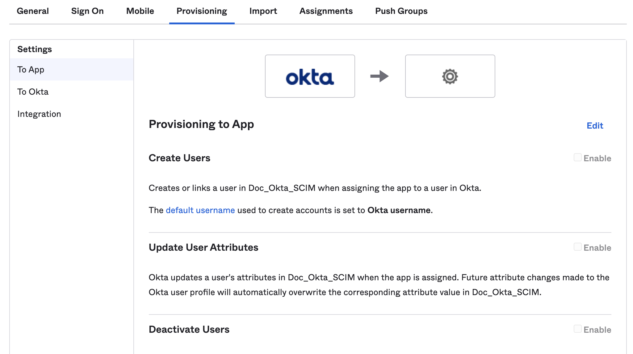 Go to the Provisioning tab, and select the To App settings.