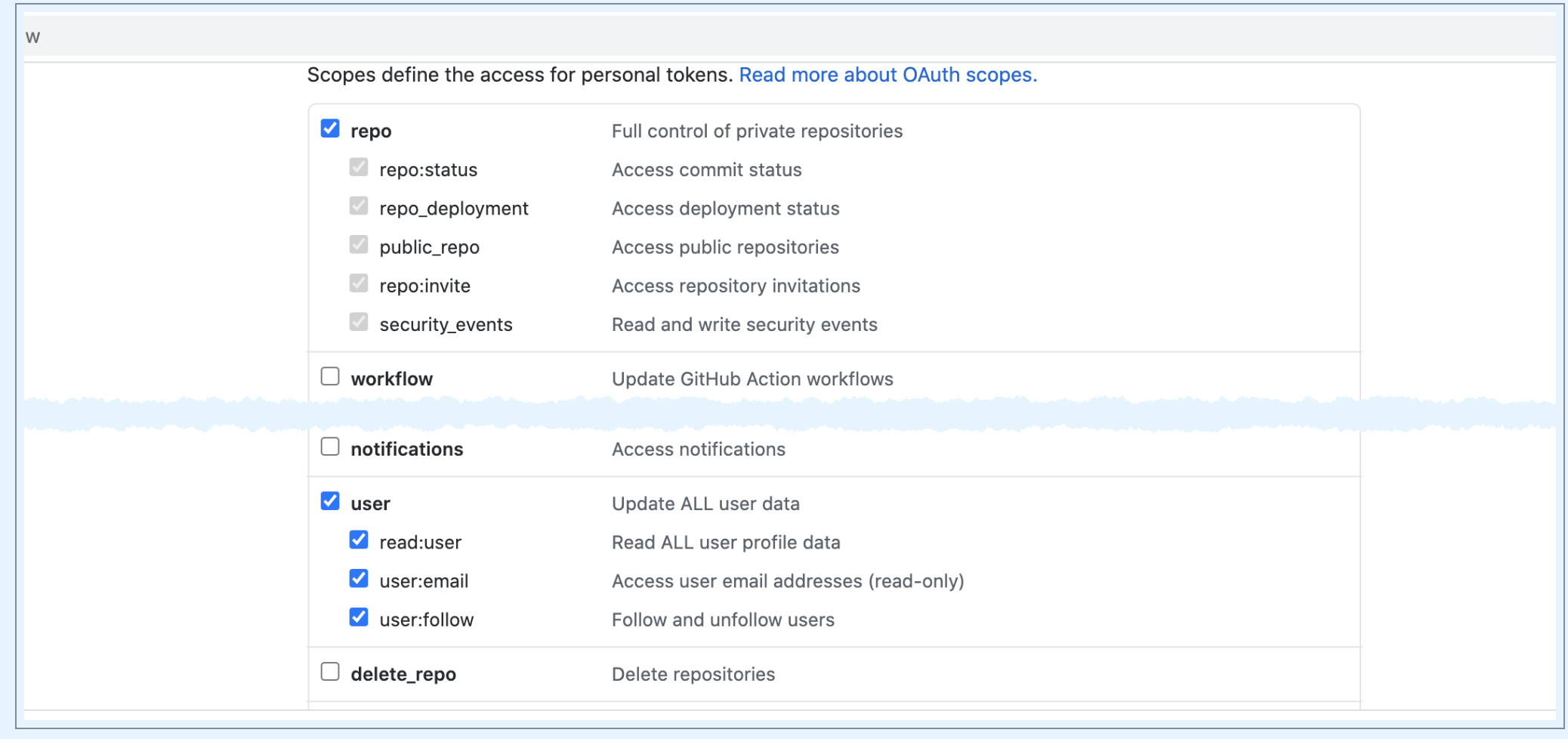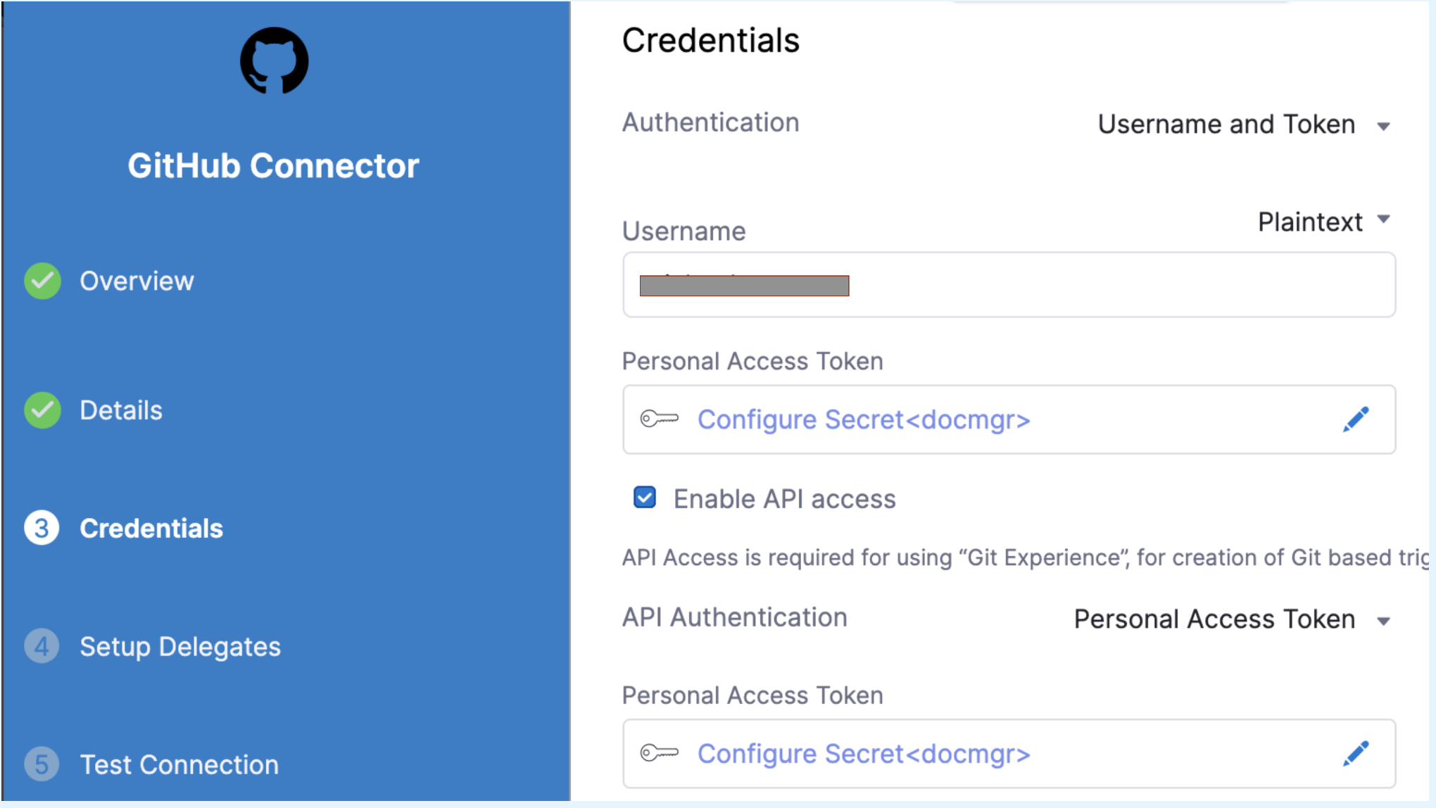 In Git Connector, select or create a Git connector to the repo for your project. For steps, go to Code Repo Connectors. noteThe Git connector must use the Enable API access option and Username and Token authentication. Harness requires the token for API access. Generate the token in your account on the Git provider and add it to Harness as a Secret. Next, use the token in the credentials for the Git Connector.  For GitHub, the token must have the following scopes: