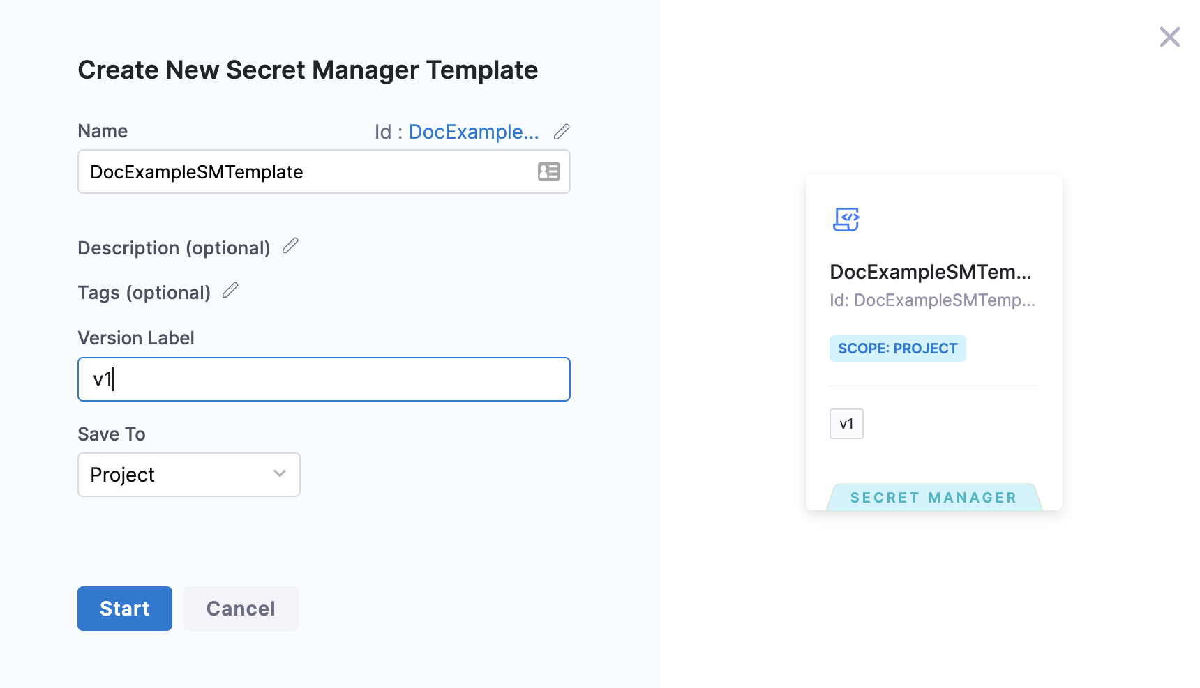 In Version Label, enter the version of the secret manager template, for example v1. Versioning a template enables you to create a new template without modifying the existing one. For more information, go to Versioning.