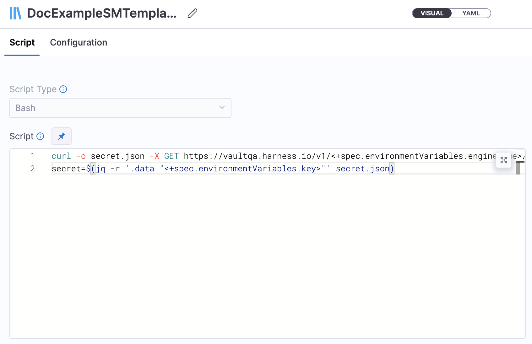 Enter your shell script in Script.   Here is an example: curl -o secret.json -X GET https://vaultqa.harness.io/v1/<+spec.environmentVariables.engineName>/<+spec.environmentVariables.path> -H 'X-Vault-Token: <+secrets.getValue("vaultTokenOne")>'