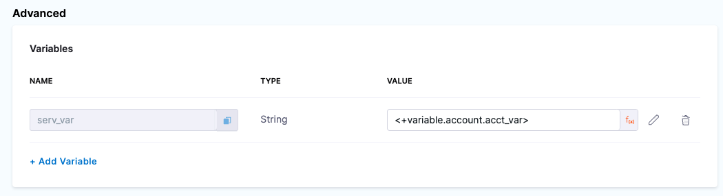 - Service variable reference: <+serviceVariables.VARIABLE_NAME>