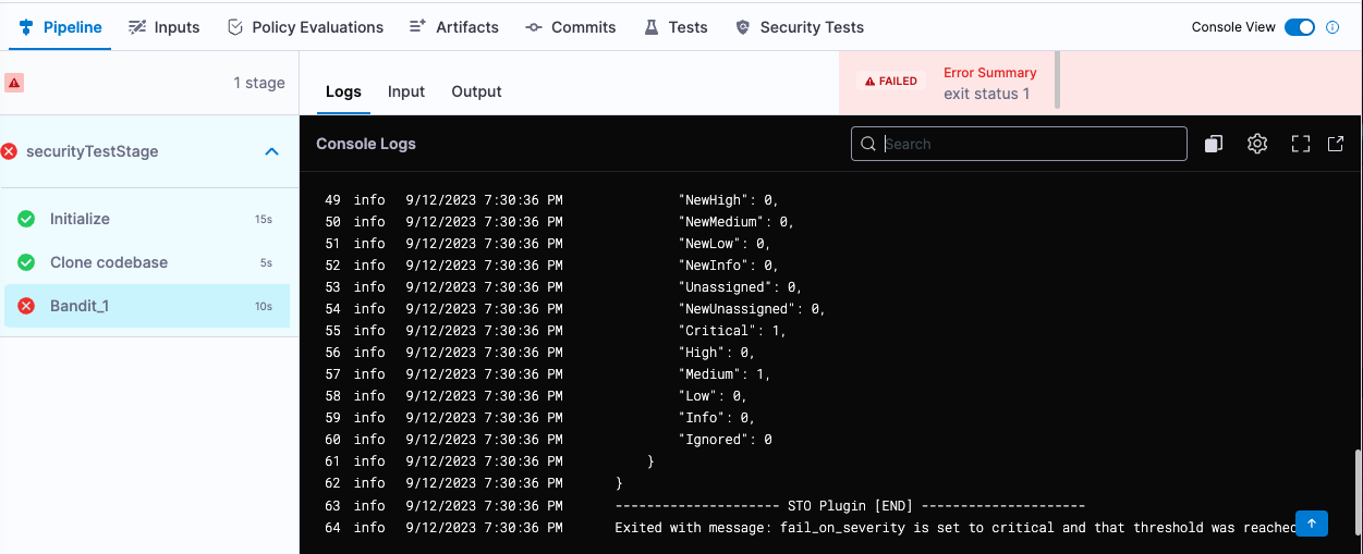 2. The scanner detects issues and the Security Test step generates an error.