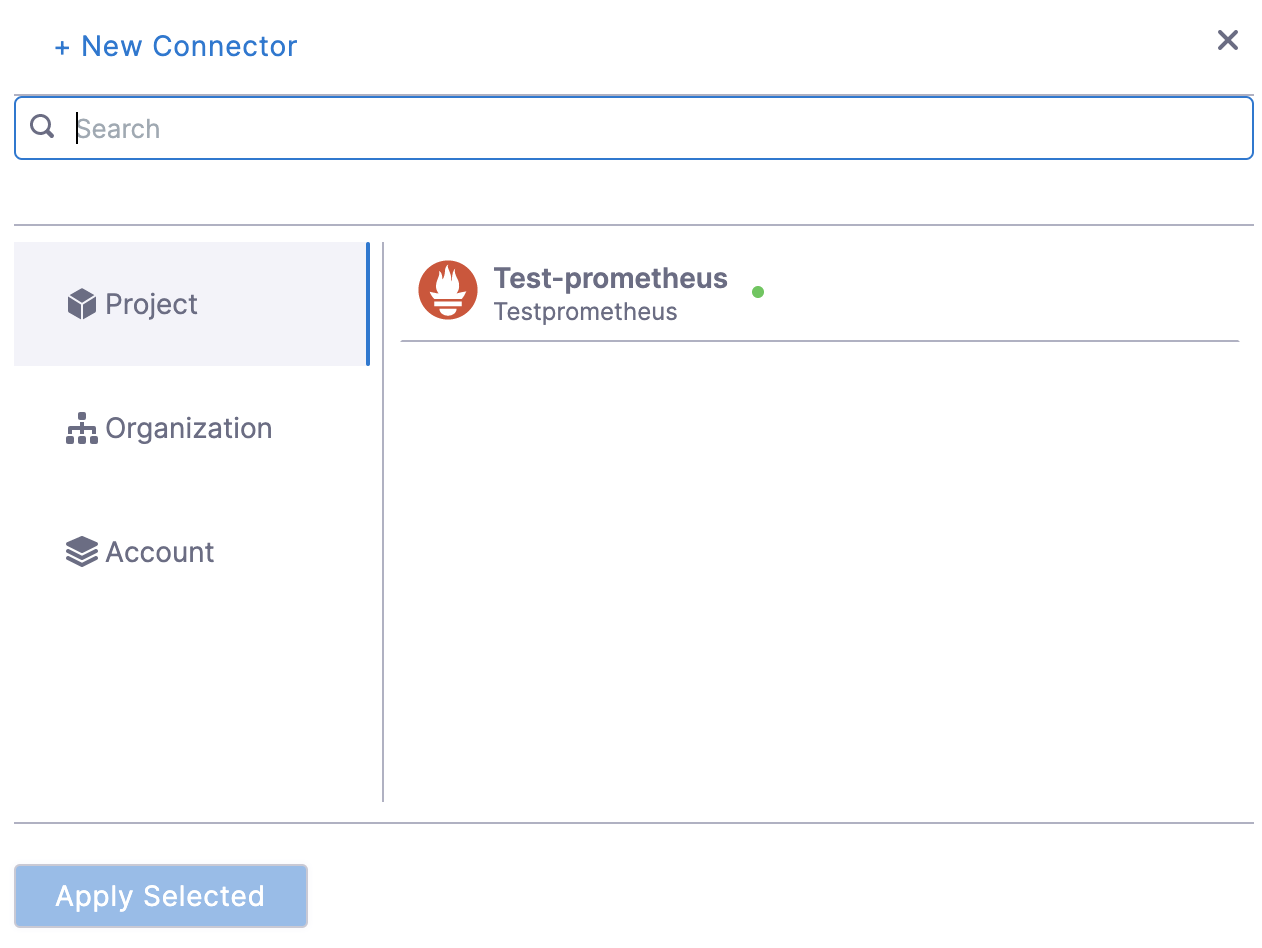 - After selecting the connector, click Apply Selected. The Connector is added to the Health Source.