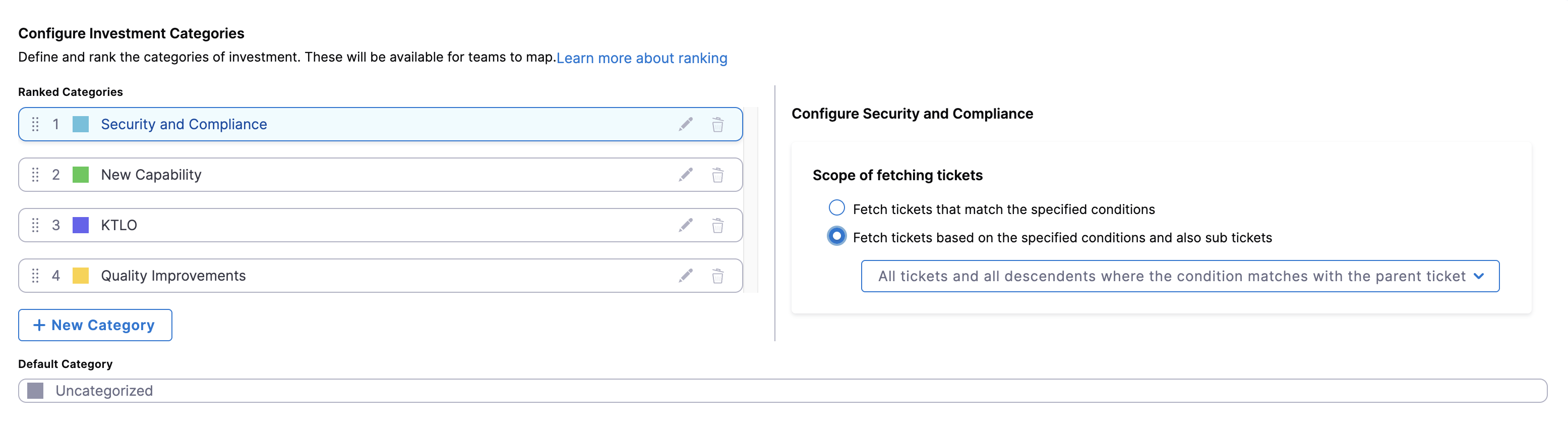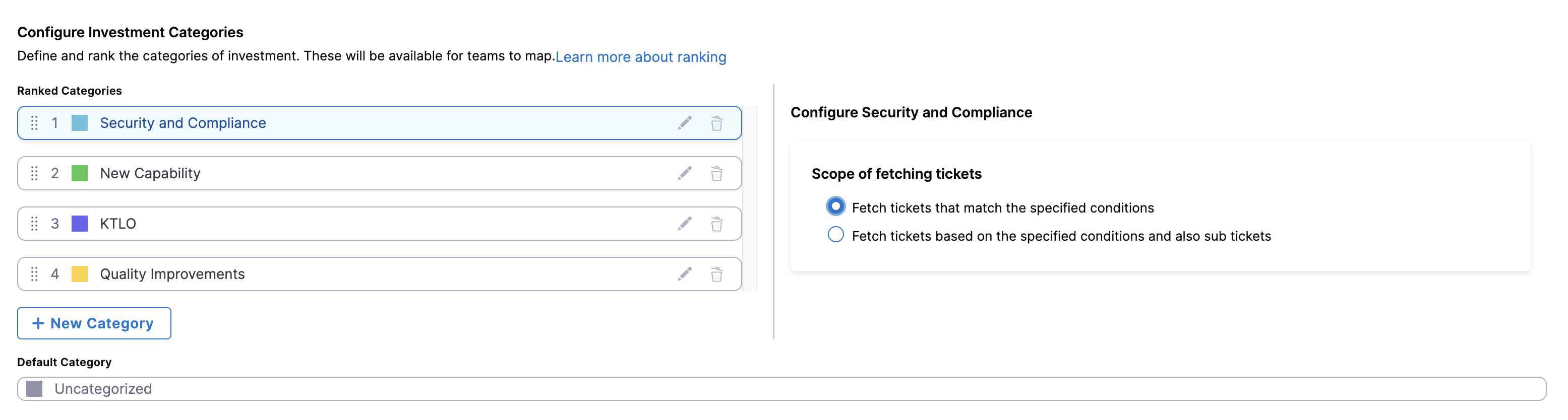 Define and rank investment categories your organization wants to track.  - In the Scope of fetching tickets section, select the relevant scope type and apply filters to narrow the computation scope. For advanced configuration, see Scoping of fetching tickets.