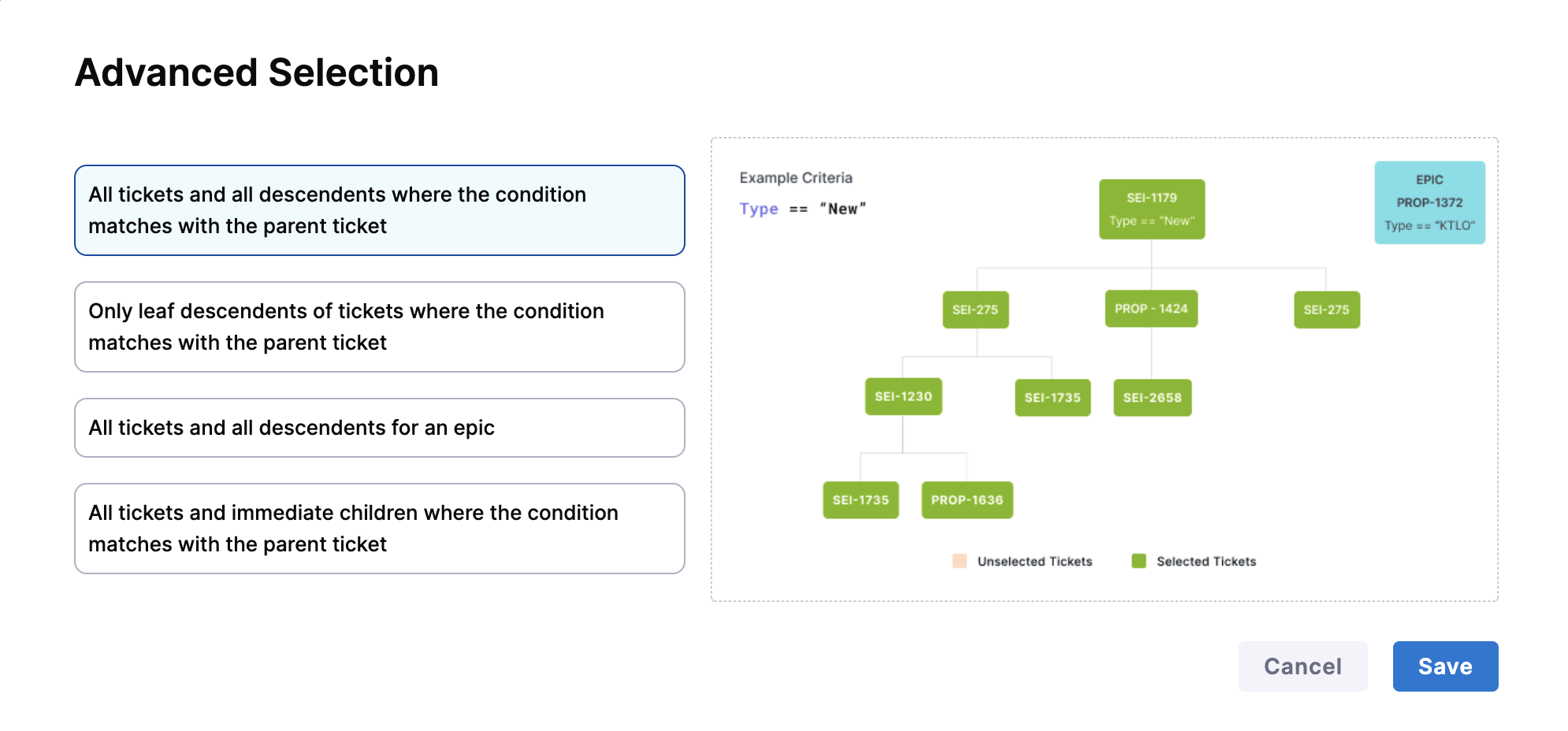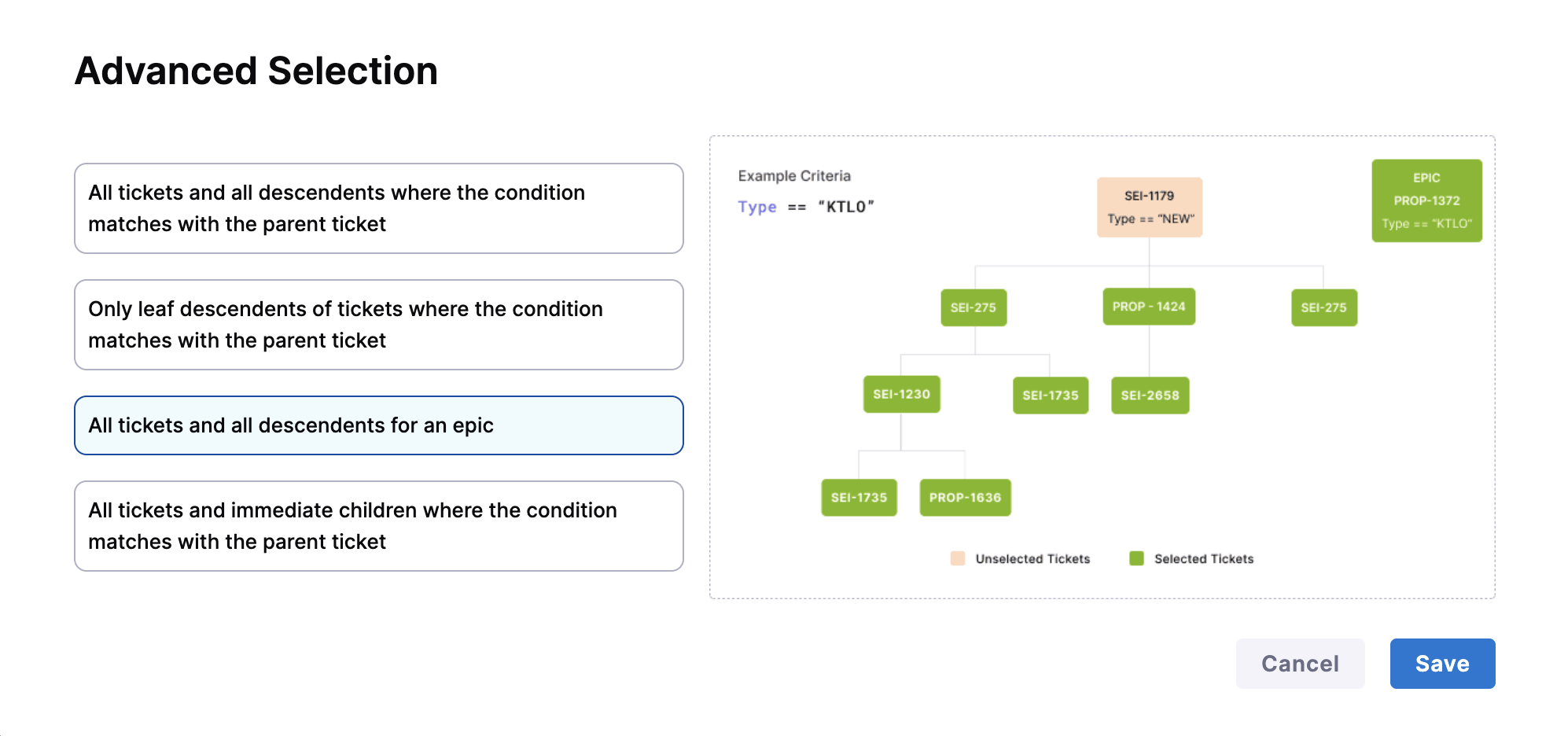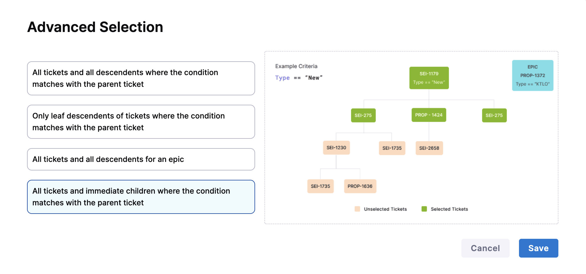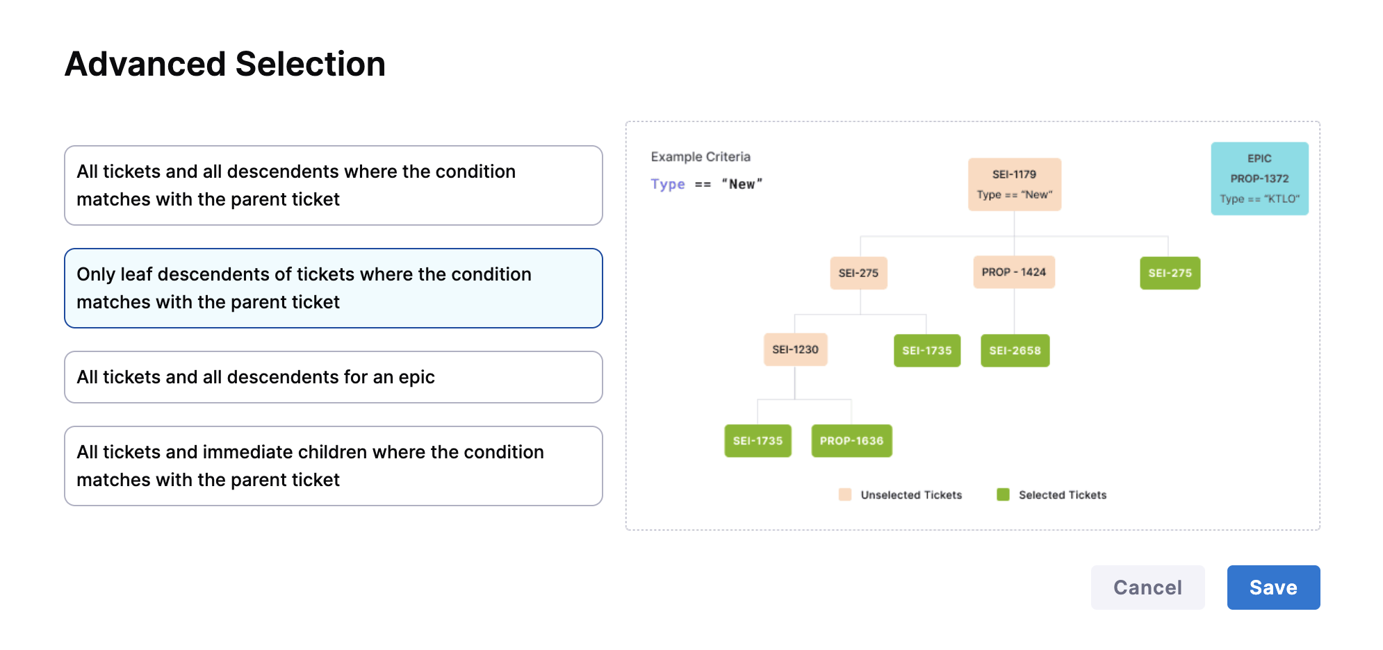 Only leaf descendents of tickets where the condition matches with the parent ticket: Includes only the terminal (leaf) child tickets from matched parent tickets. Useful when work is primarily tracked at the leaf level.